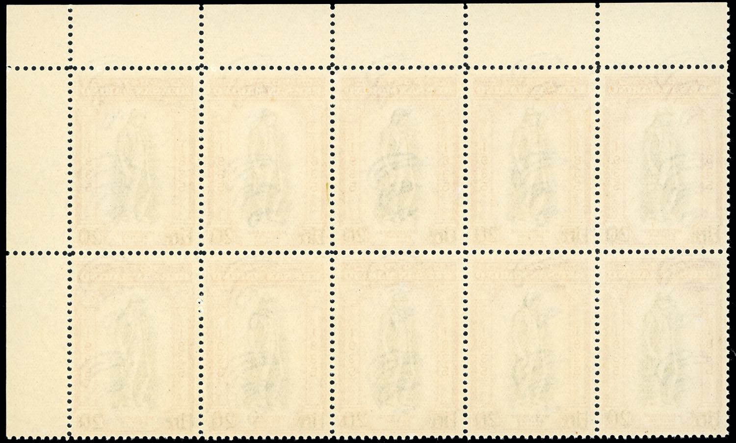 1942 - 200 lire su 75 cent. Delfico soprastampato (227), blocco di 10 esemplari, angolo di foglio, gomma originale integra, perfetto e di ottima qualità. Ferrario.