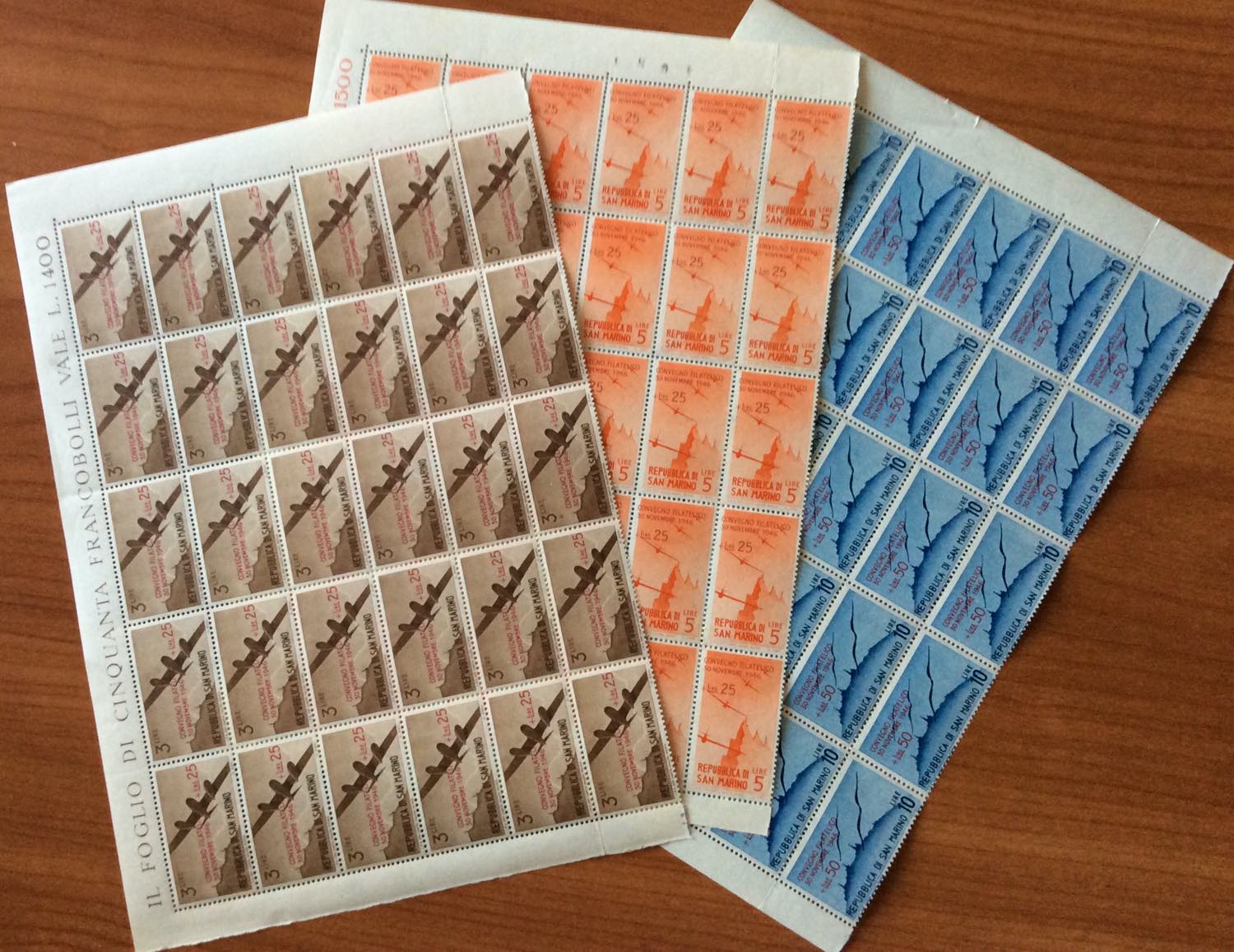 1946 - Convegno Filatelico, serie completa (298/300), blocchi di 30 esemplari, angolo di foglio, gomma originale integra, perfetti.