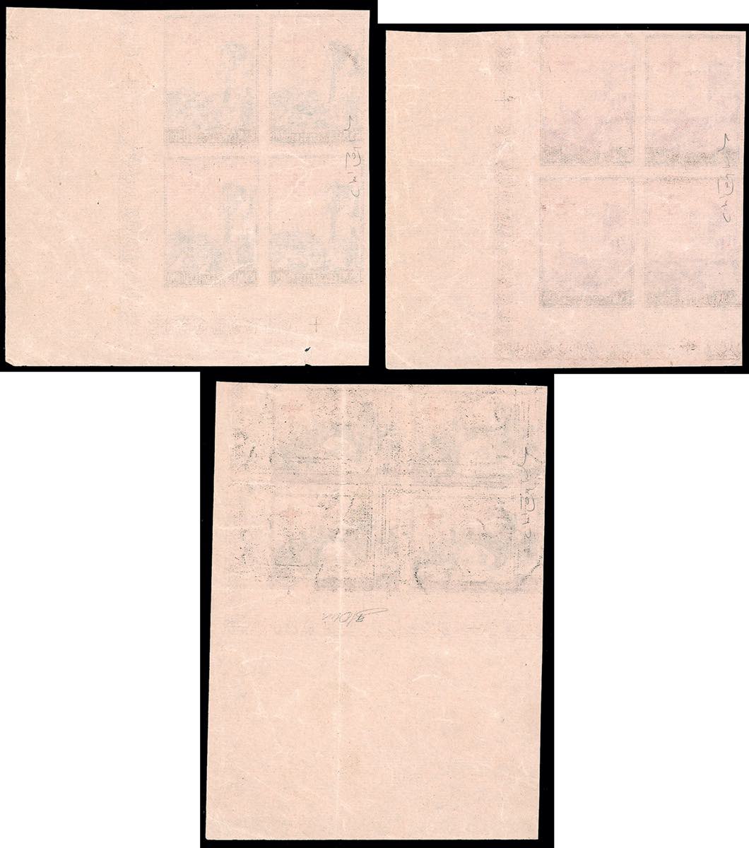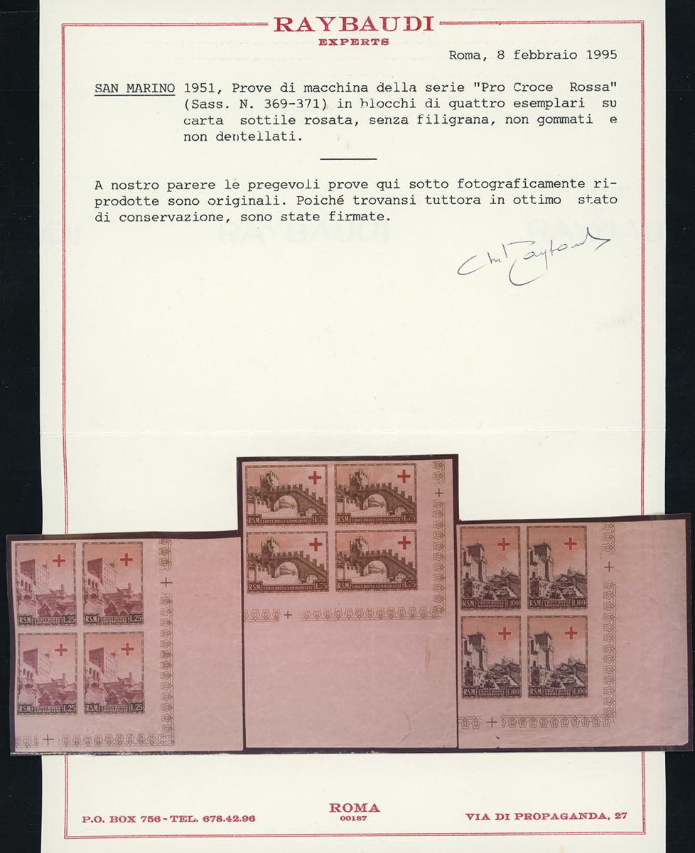 1951 - Croce Rossa, serie completa (369/371), prove di macchina su carta sottile rosa, senza filigrana, non dentellata e senza gomma, blocchi di quattro, angolo di foglio, perfetti. Rari! Cert. Raybaudi.