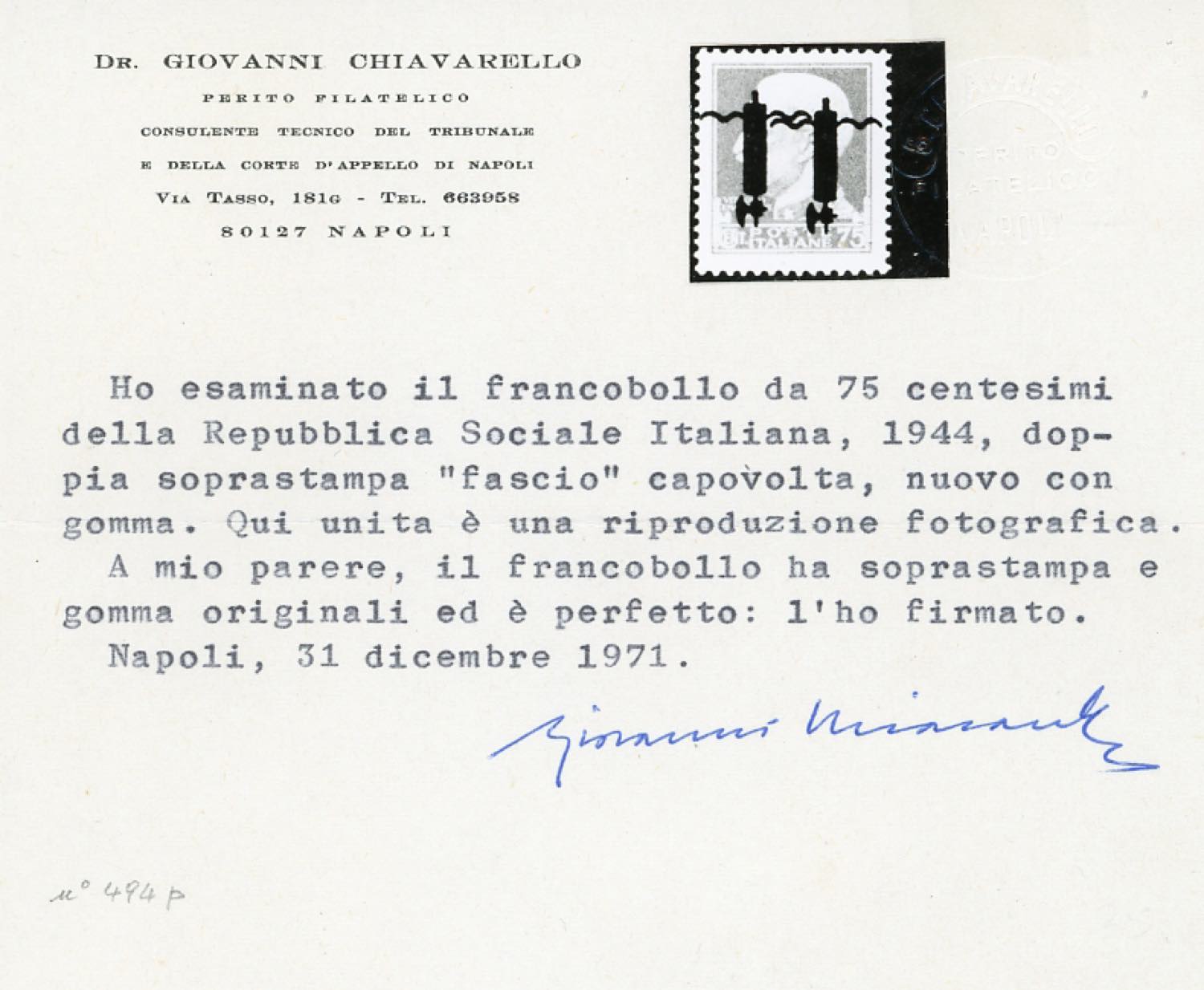 REPUBBLICA SOCIALE ITALIANA 1944 - Bell'insieme di 10 francobolli della serie Fascetti con errori di colore o scambi della soprastampa, tutti nuovi e garantiti originali. Un certificato e tutti firmati da noti periti.