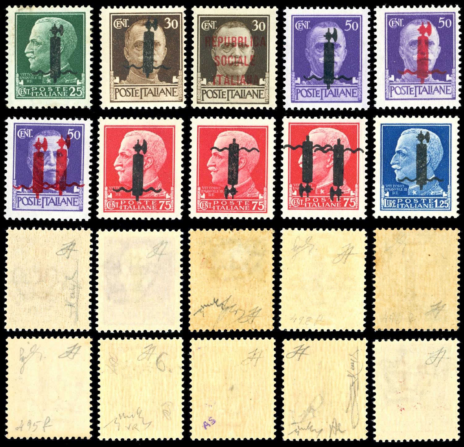 REPUBBLICA SOCIALE ITALIANA 1944 - Bell'insieme di 10 francobolli della serie Fascetti con errori di colore o scambi della soprastampa, ... Leggi tutto