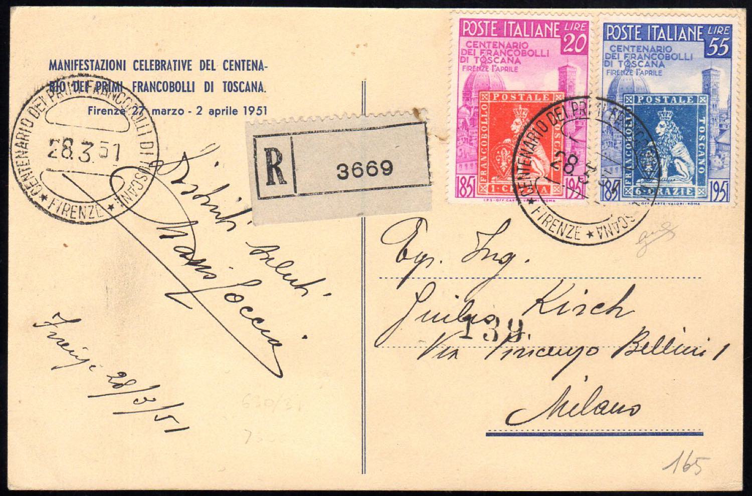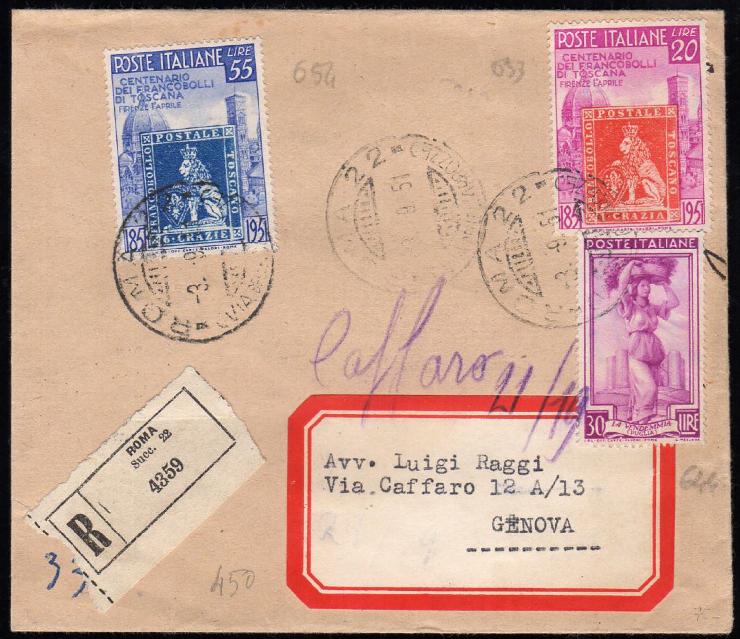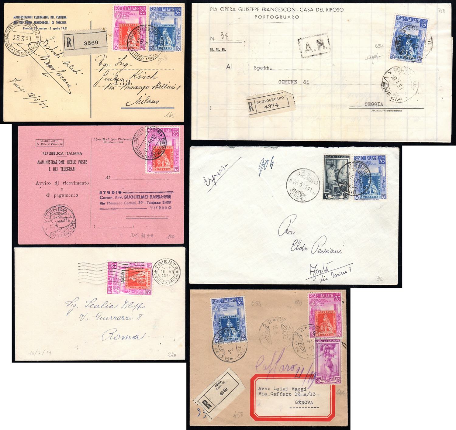 REPUBBLICA ITALIANA 1951 - Sei lettere affrancate con i francobolli del Centenario di Toscana, tra cui un raro uso del 55 lire isolato su raccomandata per l'interno.