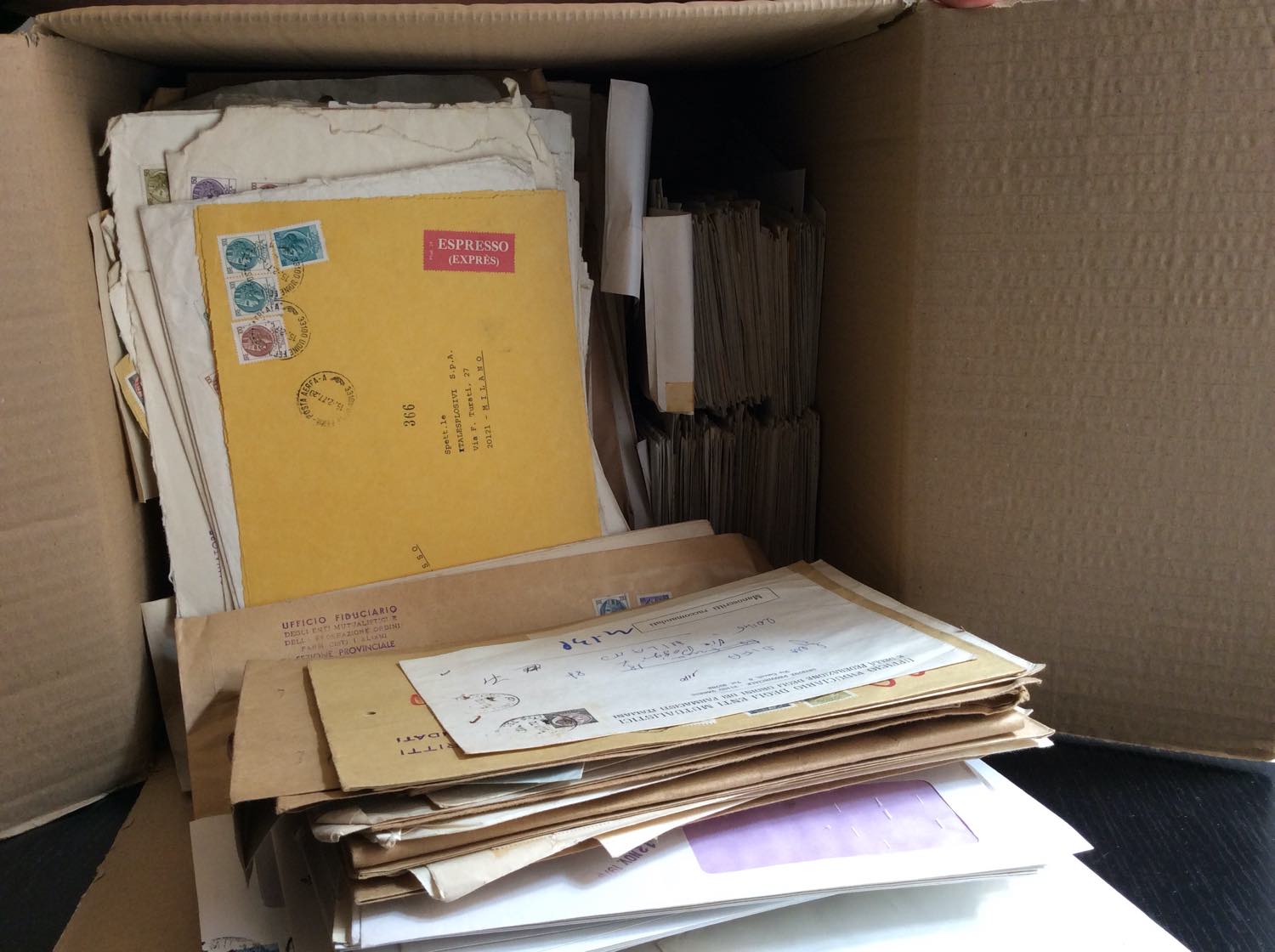 REPUBBLICA ITALIANA 1954/1990 - Enorme accumulazione di centinaia di lettere affrancate con valori SIRACUSANA, in un grande scatolone. ... Leggi tutto