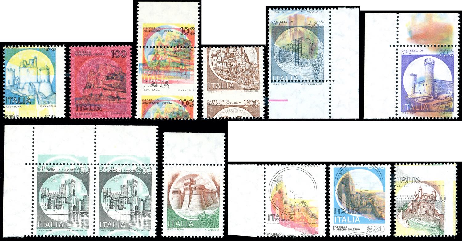 REPUBBLICA ITALIANA VARIETA' 1980/1992 - Splendido insieme di 12 francobolli della serie Castelli d'Italia con appariscenti e rare varietà, gomma integra, ottima qualità. Ex collezione Lemano.