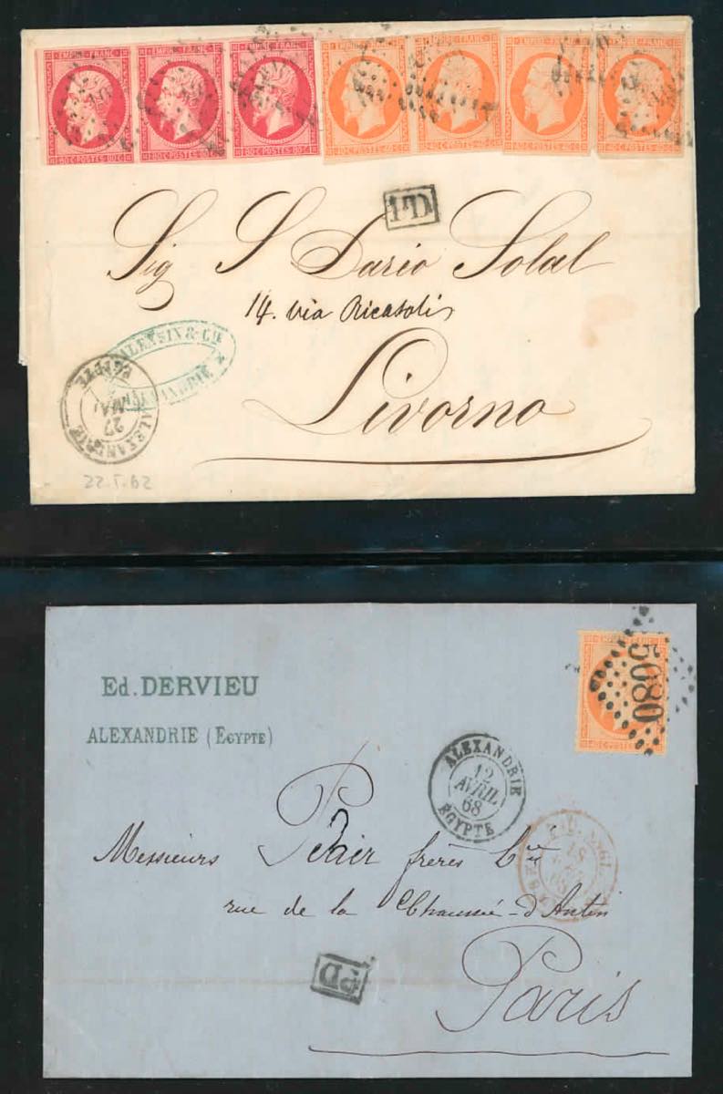 FRANCIA UFFICIO POSTALE ALESSANDRIA D'EGITTO 1848/1902 - Ben avviata collezione del settore comprendente dieci lettere affrancate e tre documenti del periodo. Notate diverse rare affrancature pluricolori, di ottimo aspetto. Merita esame, ottimo anche per dettaglio.
