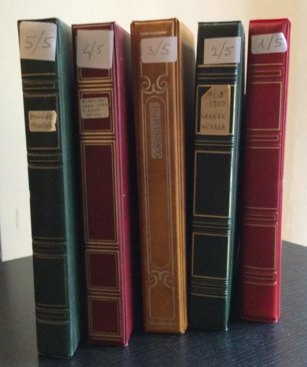CARTOLINE 1900/1945 - Vasta e importante collezione di centinaia di cartoline, per lo più viaggiate, montata in 5 album artigianali. Tre album contengono cartoline inerenti all'Unità d'Italia, alla prima e alla seconda guerra mondiale, con rare presenze di molti illustratori importanti del periodo tra cui: Boccasile, Mauzan, Sacchetti, Cascella, Codognato, Rizzani e Mazzanti. Un album inerente allo stile Liberty, notati vari illustratori tra cui: Corbella, Giannetti e Sergio Tofano. Un album inerente a navi, treni e ferrovie. Insieme raro, con possibilità di piacevoli sorprese. Ottimo per il collezionista o per il professionista.