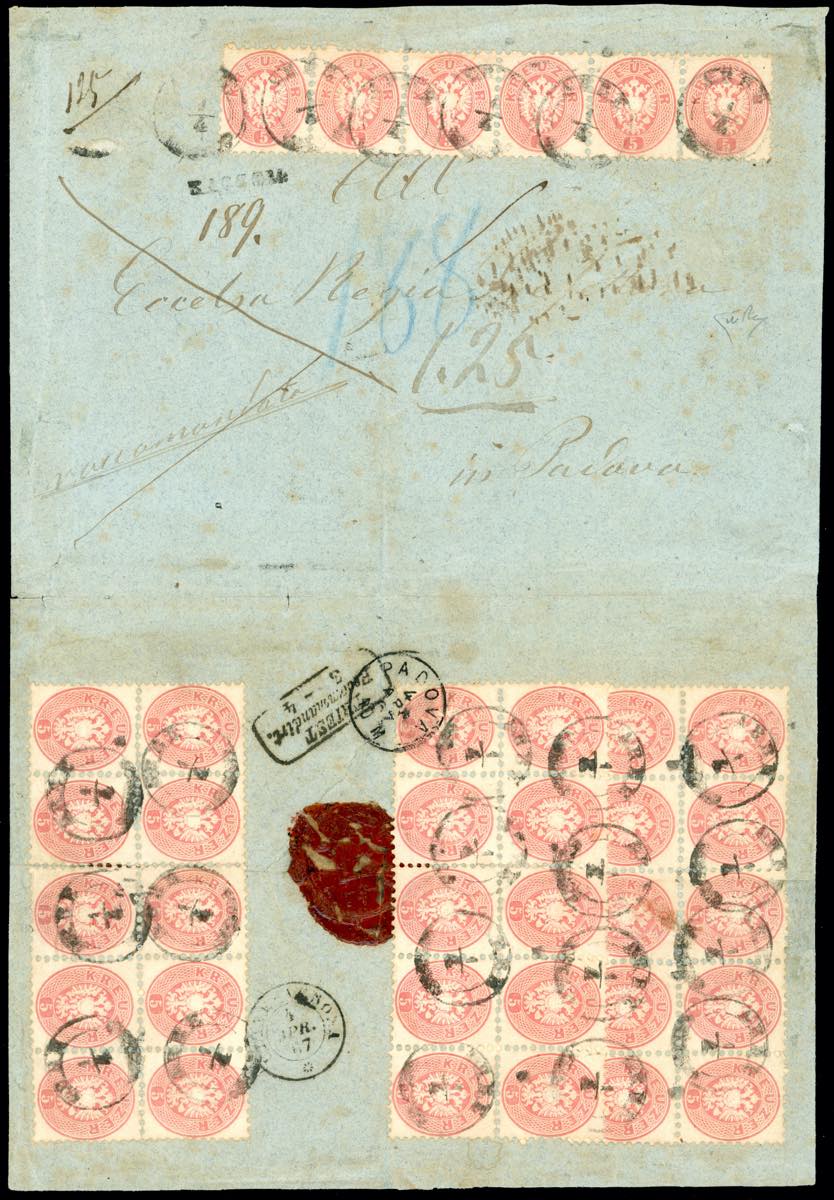 LOMBARDO VENETO-IMPERO AUSTRIACO CROAZIA 1867 - 5 kr. rosa, cent. 9 1/2 (29), striscia orizzontale di sei, e, al verso, tre blocchi di dieci, su sovracoperta di lettera raccomandata da Arbe 1/4/1867 a Padova. Eccezionale affrancatura multipla monovalore, la massima nota per questo francobollo. Rarità del settore di eccellente qualità. Da esposizione! Cert. E.Diena.