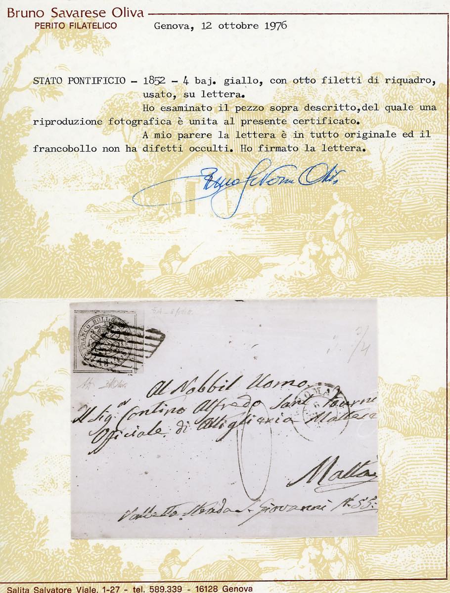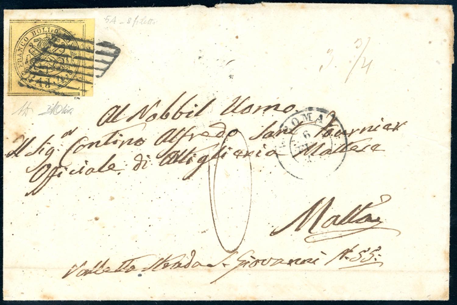 PONTIFICIO-MALTA 1867 - 4 baj giallo (5A), otto filetti, bordo di foglio, perfetto, su sovracoperta di lettera da Roma 6/2/1867 a Malta, ... Leggi tutto