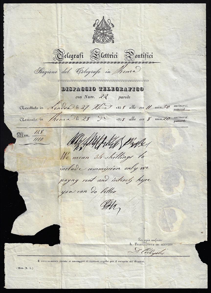 Lotto 49 - PONTIFICIO-NAPOLI 1858 - Modulo di telegramma da Londra ...