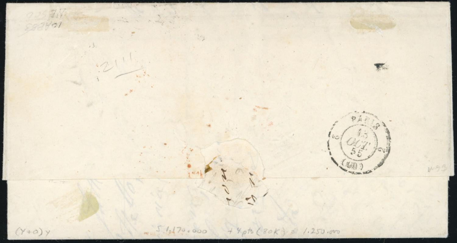 STATO PONTIFICIO-GRAN BRETAGNA-FRANCIA 1855 - 7 baj azzurro, tre esemplari, 1 baj verde grigiastro (8,2), su lettera da Ancona 6/10/1855 a Londra, rispedita a Parigi. Rara rispedizione tra due stati, di grande freschezza.