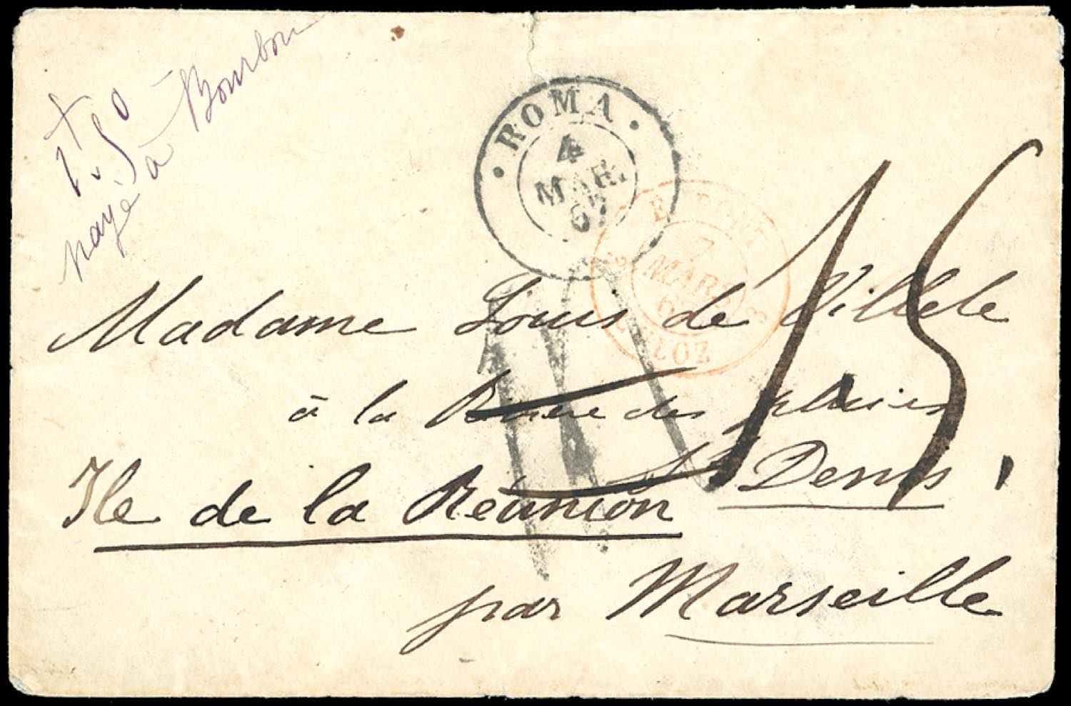 STATO PONTIFICIO-ISOLA DI REUNION 1867 - Lettera non affrancata da Roma 4/3/1867 a Saint Denis, Isola di Reunion, via Marsiglia, tassata inizialmente 40 cent. (probabilmente per l'omonimia della località di destinazione con la città in Francia), cassati e corretti in 1,50 franchi. L'isola di Reunion, sperduta nell'Oceano Indiano, è sicuramente una delle destinazioni più affascinanti dello Stato Pontificio. Estremamente rara, due o tre casi noti.