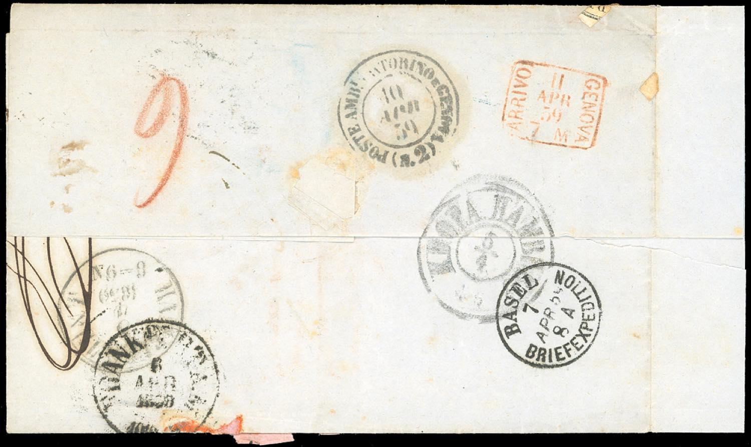 SARDEGNA-NORVEGIA 1859 - Lettera non affrancata da Bergen 31/3/1859 a Genova, numerosi segni di tassa sul fronte e bolli di transito al verso. Sul fronte venne applicato il segnatasse (3), con datario Verbano (2) 10/4/1859, con annotazione delle tasse estere e di quella interna. Estremamente rara, DUE SOLE LETTERE NOTE DALLA NORVEGIA CON IL SEGNATASSE SARDO. Chiavarello, cert. Ferrario. Ex coll. Imperato.