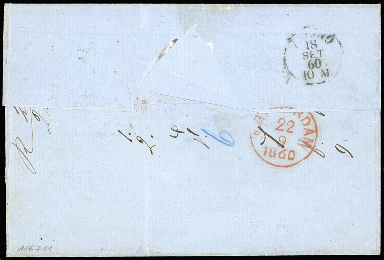 SARDEGNA-OLANDA 1860 - 20 cent. azzurro, perfetto, 40 cent. rosso, leggermente corto a destra (15Ca,16C), su fresca sovracoperta di lettera da Milano 17/9/1860 ad Amsterdam, affrancata insufficientemente e tassata. Rara. Ex coll. Imperato.