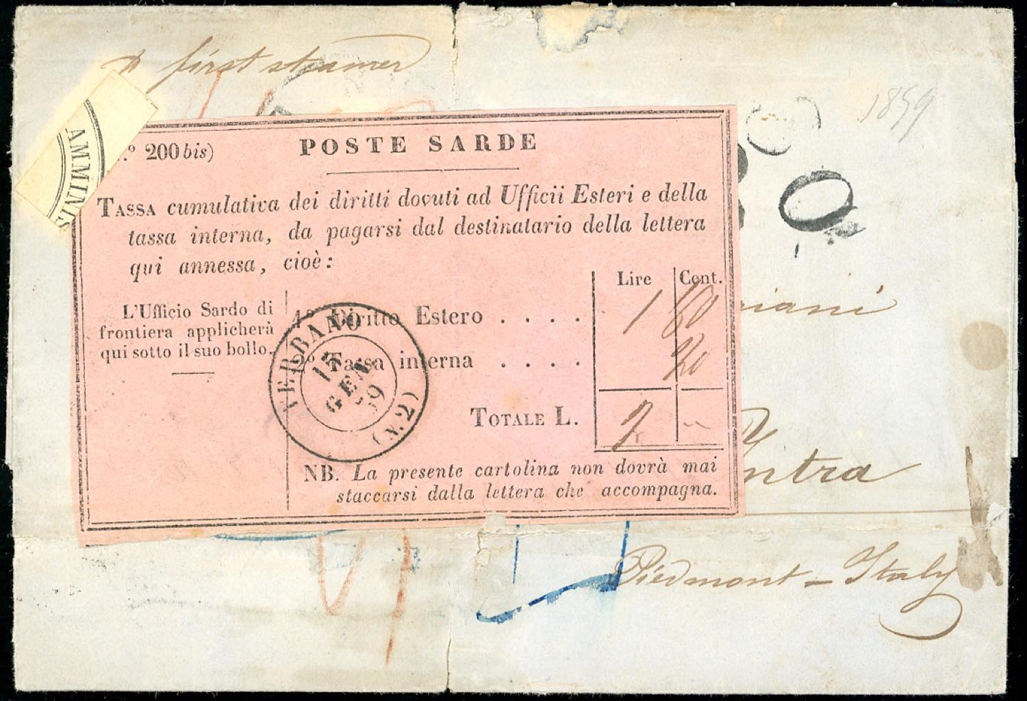 Lotto 86 - SARDEGNA-STATI UNITI 1859 - Lettera non affrancata da New ...