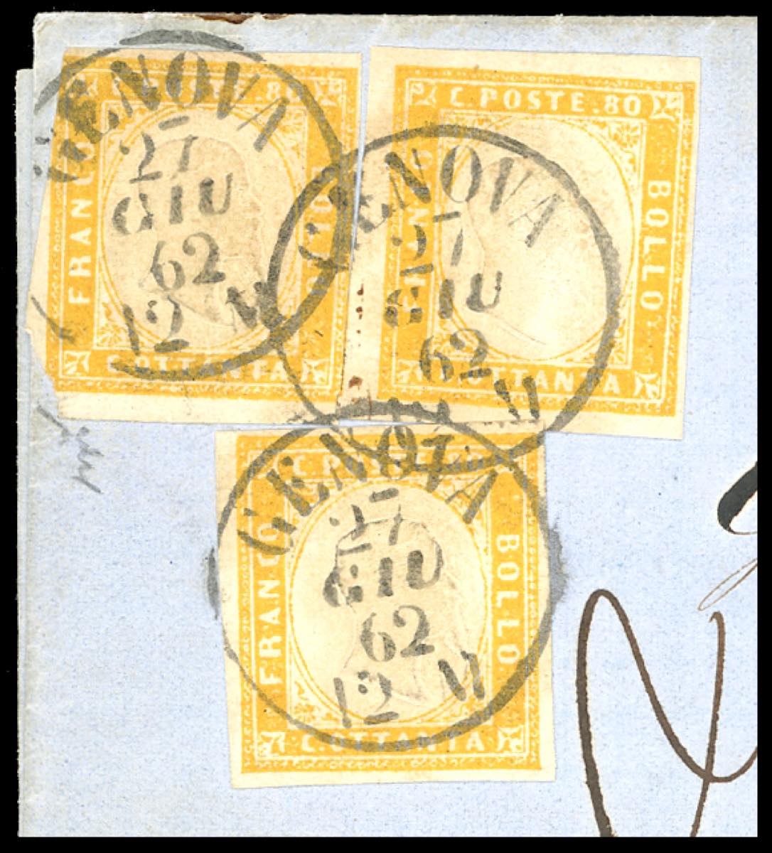 SARDEGNA-STATI UNITI 1862 - 80 cent. giallo arancio (17c), tre esemplari, due perfetti, uno leggermente difettoso, su lettera di doppio porto pagata a destino da Genova 27/6/1862 a New York, via di Francia. Sul fronte il bollo di tassa a tampone "18" in rosso, apposto dall'ufficio ambulante francese, ad indicare le competenze per la Francia secondo la Convenzione con gli USA del 1857. Delle DUE LETTERE AD OGGI NOTE con la tassa a tampone "18" in rosso, questa è l'unica dall'Italia agli Stati Uniti. Per specialista. Chiavarello. Ex coll. Imperato, con dettagliata descrizione.