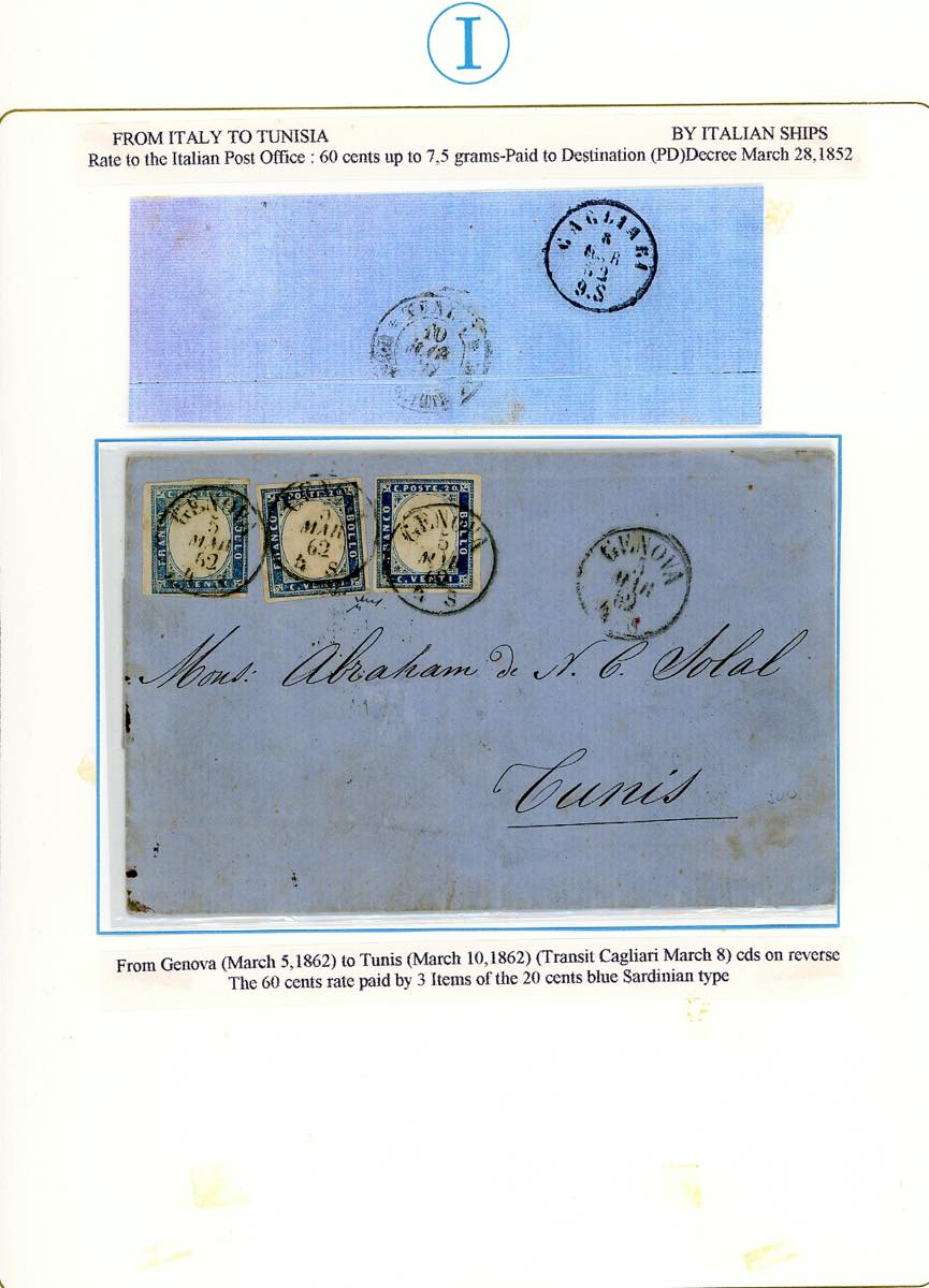 SARDEGNA-TUNISIA 1862 - 20 cent. celeste (15Da), tre esemplari uno con tinta diversa, due perfetti, l'altro a filo a destra, su lettera da Genova 5/3/1862 a Tunisi. Non comune. Chiavarello. Ex coll. Imperato.