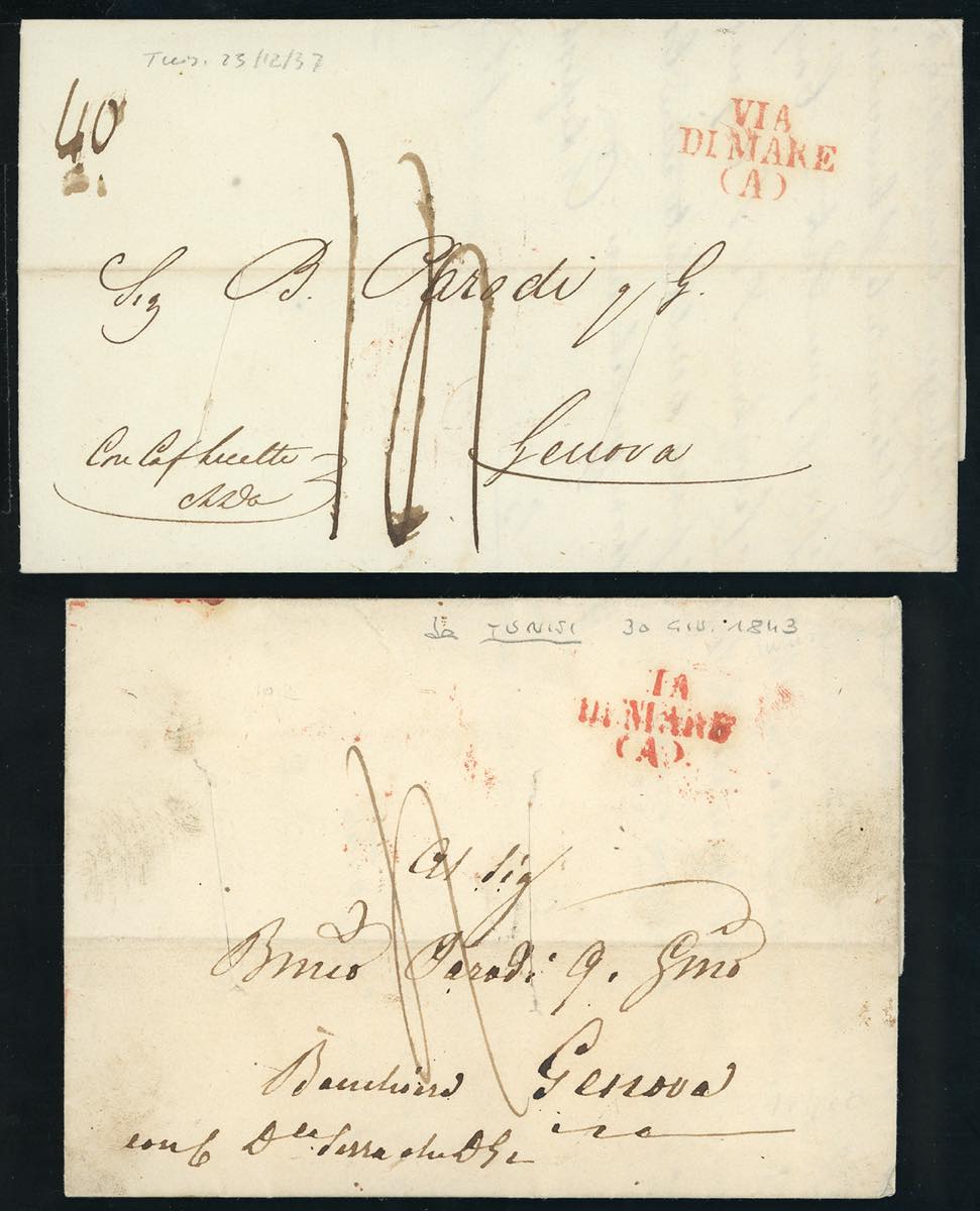 SARDEGNA-TUNISIA 1937/1943 - Due lettere prefilateliche da Tunisi, una del 22/12/1837, l'altra del 30/6/1843, entrambe per Genova, con bollo "Via di mare (A)" in rosso, tagli di disinfezione, con tassazioni differenti. Ex coll. Imperato.