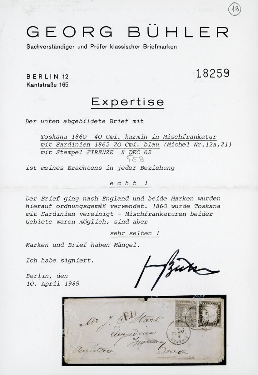 TOSCANA GOVERNO PROVVISORIO-GRAN BRETAGNA 1862 - 40 cent. carminio (21), in affrancatura mista con 20 cent. IV emisisone di Sardegna (15C), lievi difetti di marginatura, su piccola busta da Firenze 6/2/1862 per l'Inghilterra. Rara. Cert. Buhler.