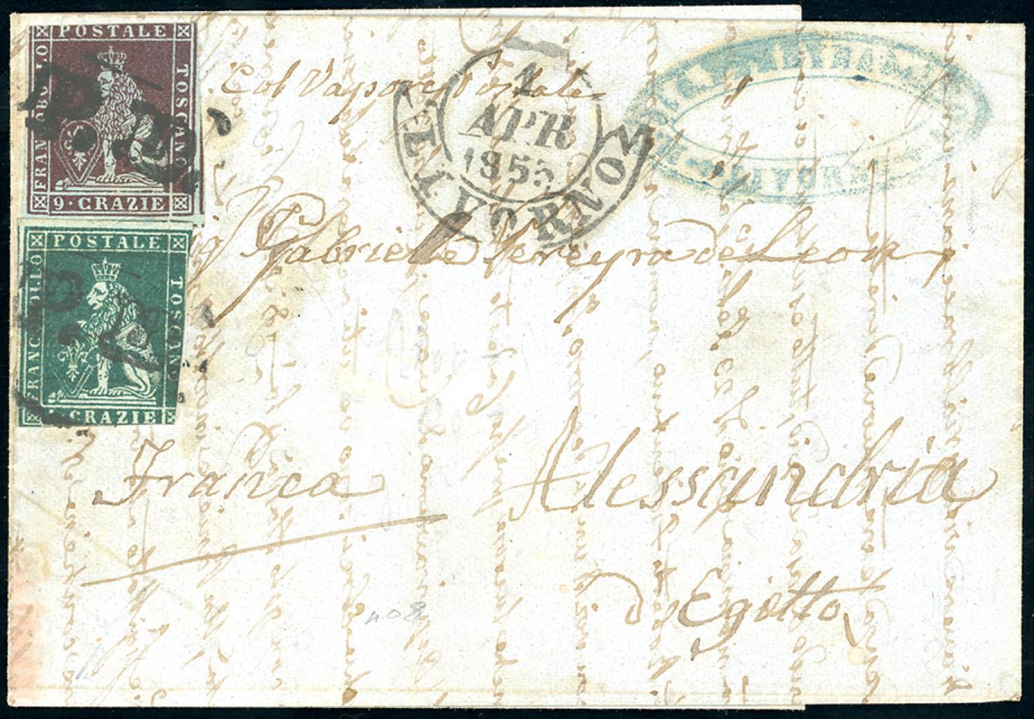 TOSCANA-EGITTO 1853 - 4 crazie verde azzurro su grigio, 9 crazie viola bruno scurissimo su azzurro (6c,8a), margini da ottimi a corti, su lettera da Livorno ad Alessandria d'Egitto, al verso il bollo d'arrivo dell'ufficio postale francese. Pregevole destinazione.