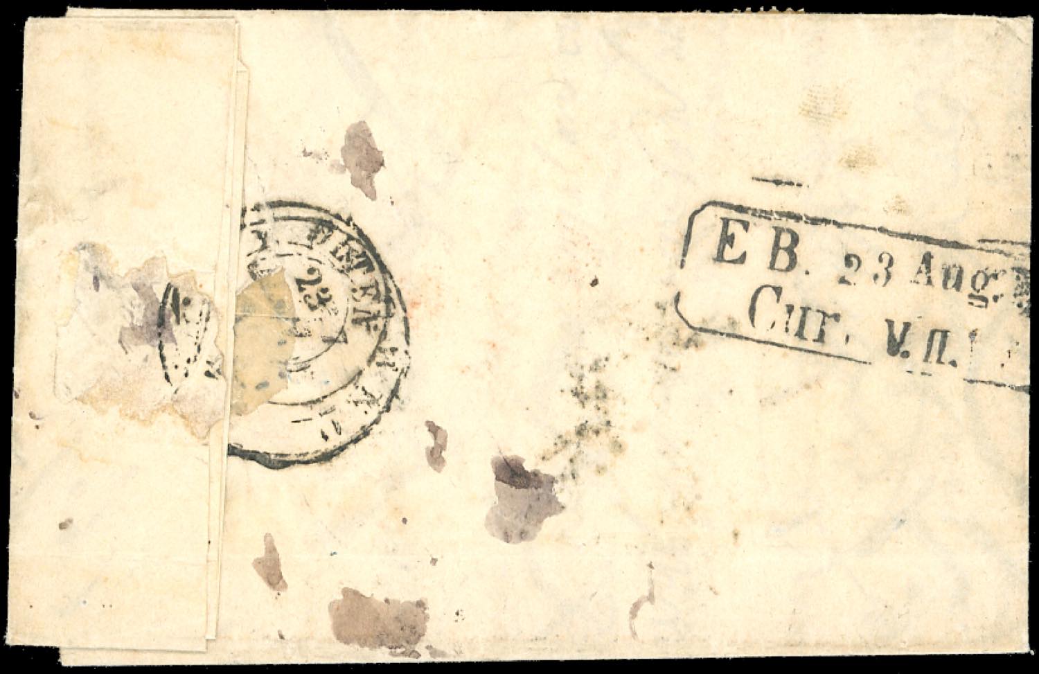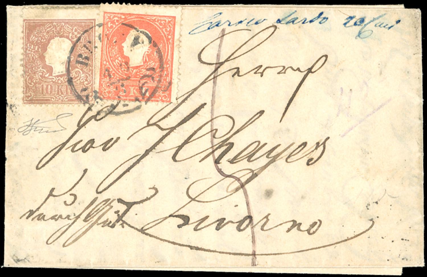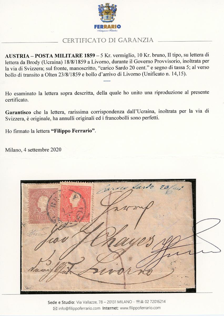 TOSCANA-IMPERO AUSTRIACO UCRAINA - 5 kr. vermiglio, 10 kr. bruno, entrambi II tipo (Unificato 14,15), perfetti, su lettera da Brody 18/8/1859 a Livorno, in periodo di Governo Provvisorio, inoltrata per la via di Svizzera (al verso il transito ad Olten 23/8/1859), sul fronte tassa 5 e manoscritto "carico Sardo 20 c.mi". La via di Svizzera era l'unica soluzione possibile per il transito della corrispondenza a causa delle ostilità della II Guerra d'Indipendenza. Di eccezionale interesse e rarità per il periodo storico. Cert. Ferrario.