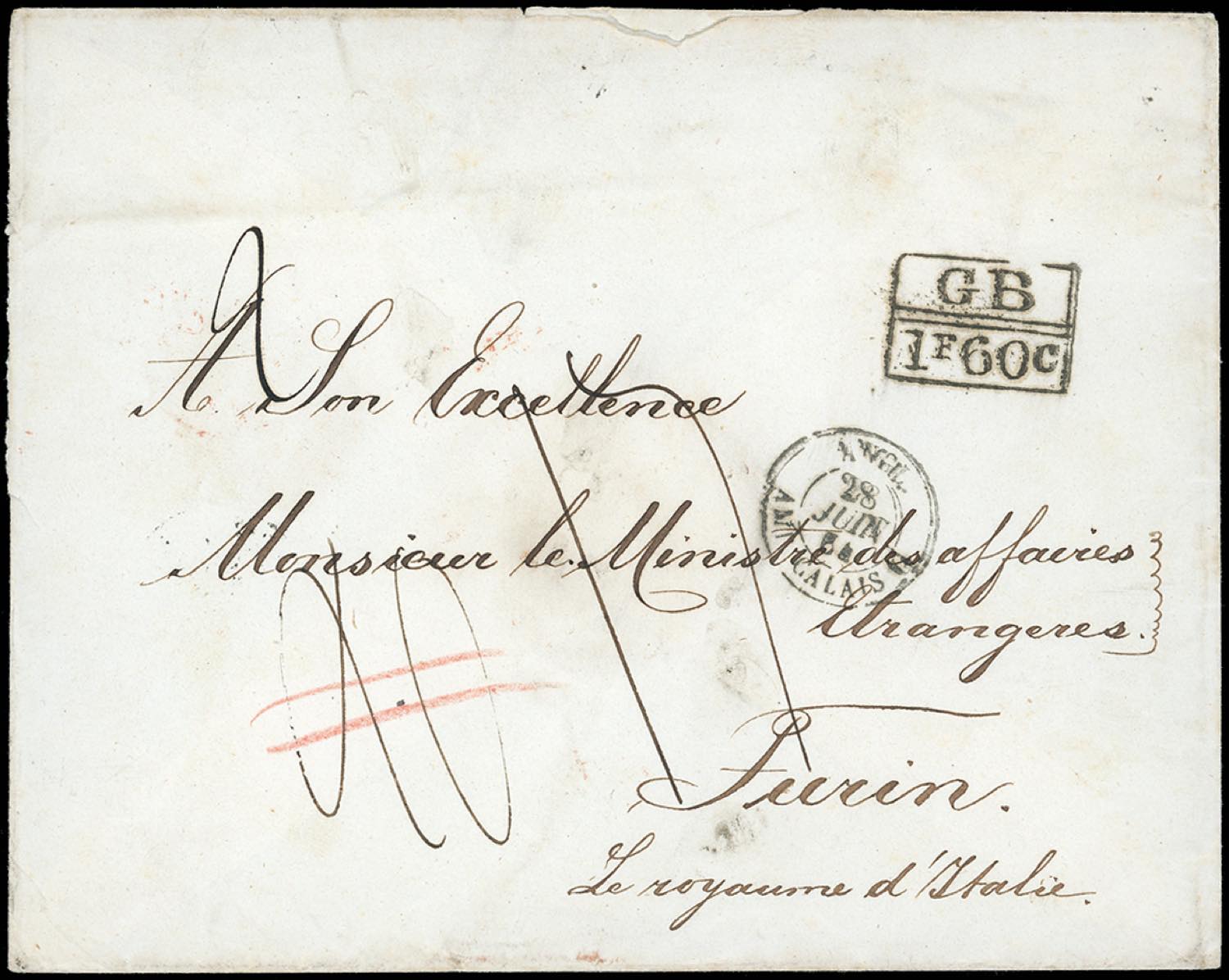 REGNO D'ITALIA-ST. THOMAS 1864 - 13 June 1864, double-rate unpaid letter from St. Thomas, Danish Antilles, to Turin. The letter was handed to the British agent who embarked it on the RMSP packet Shannon to be disembarked at Southampton on 27 June. The accountancy marking "GB/1'60", debiting France 1.60 francs for each 30 grams of weight carried to France, was applied in London. The letter was then carried to France as per the datestamp of the Travelling Post Office Calais-Paris. On arrival in Turin the double rate of 20 decimi was reduced to 1.70 lire because the addressee enjoyed free domestic postage. (ex. coll. Mentaschi).