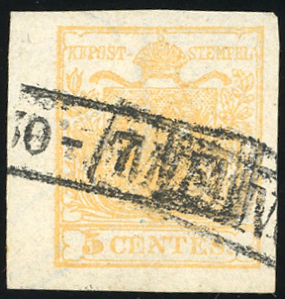 1850 - 5 cent. giallo ocra, ampie porzioni di filigrana (1), bordo di foglio, perfetto, usato a Milano. Ferrario.