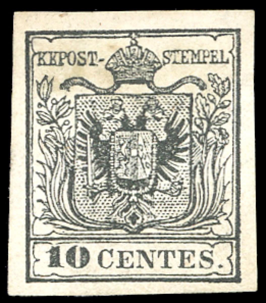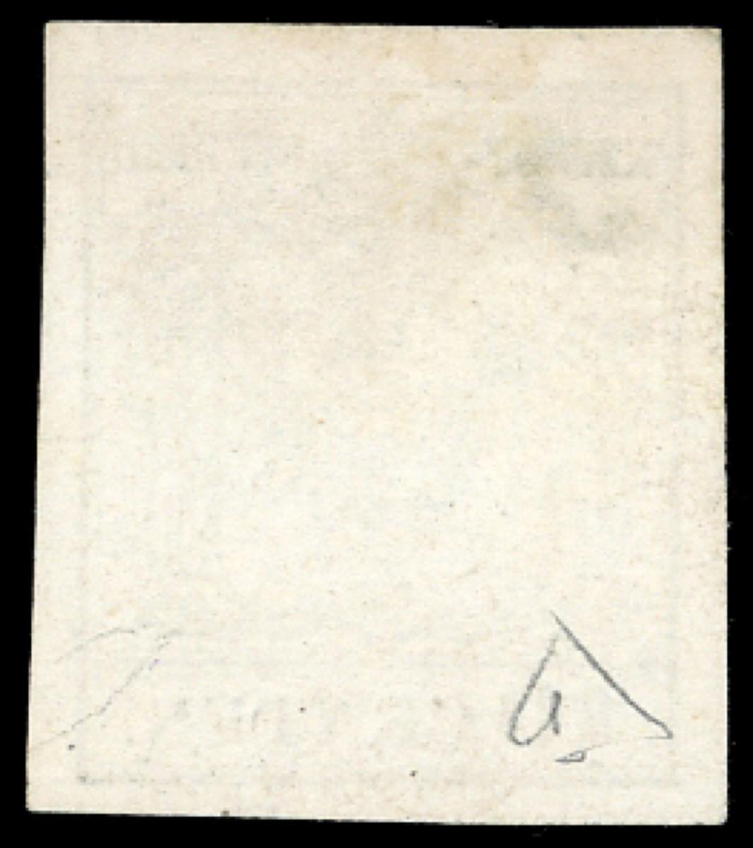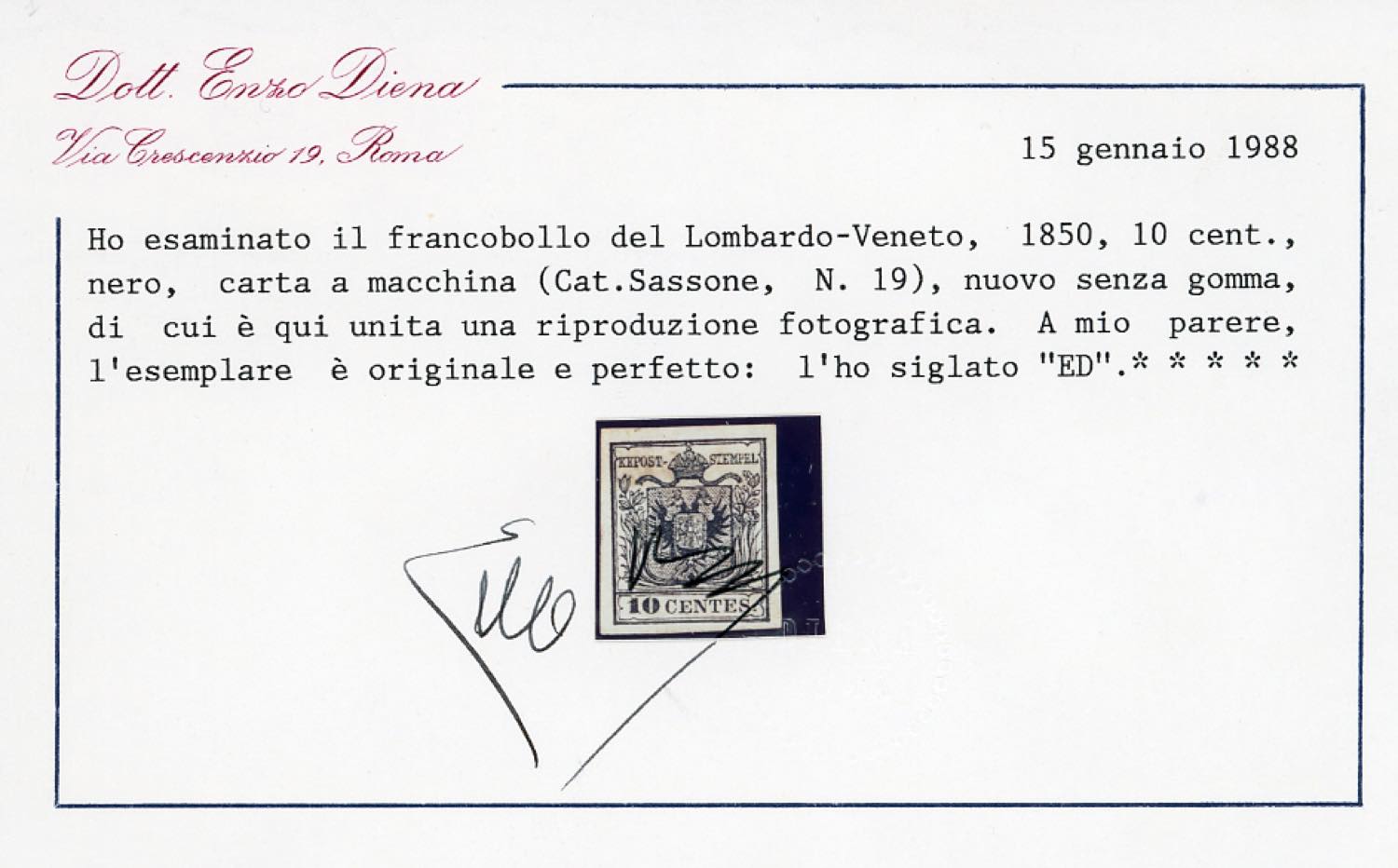 1857 - 10 cent. nero, carta a macchina (19), nuovo senza gomma, perfetto e con ottimi margini. Molto bello. Cert. E.Diena.