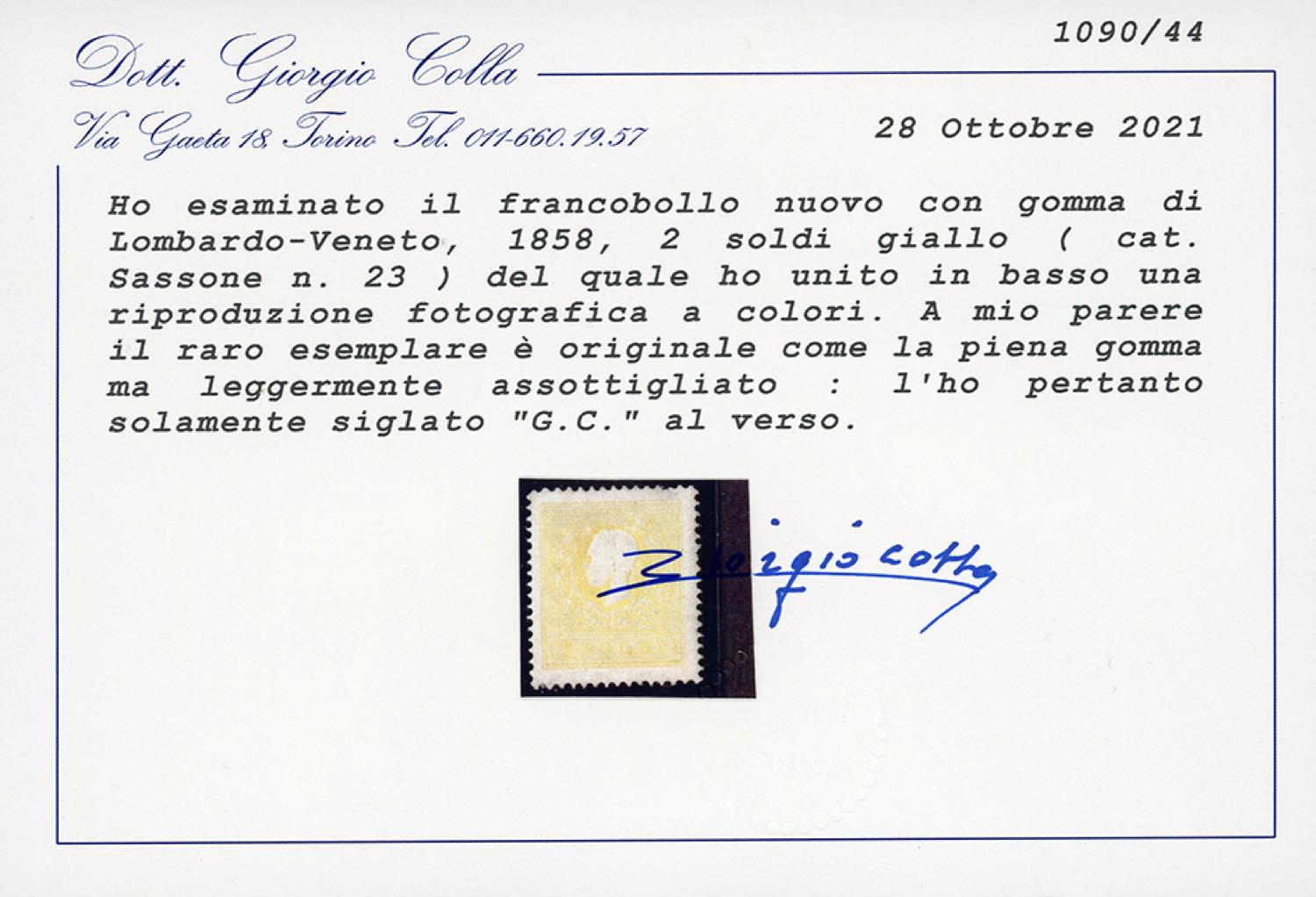 1858 - 2 soldi giallo, I tipo (23), gomma originale, piccolo punto di assottigliamento in alto al verso. Raro, occasione. Cert. Colla.
