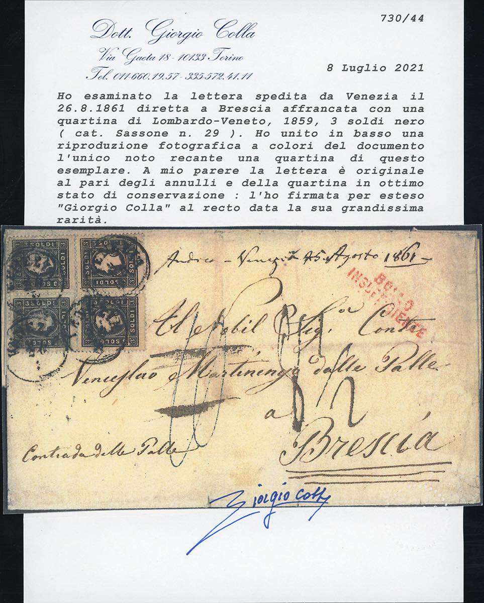 1861 - 3 soldi nero, II tipo (29), blocco di quattro, ottimo stato, su sovracoperta di lettera da Venezia 26/8/1861 a Brescia, ... Leggi tutto