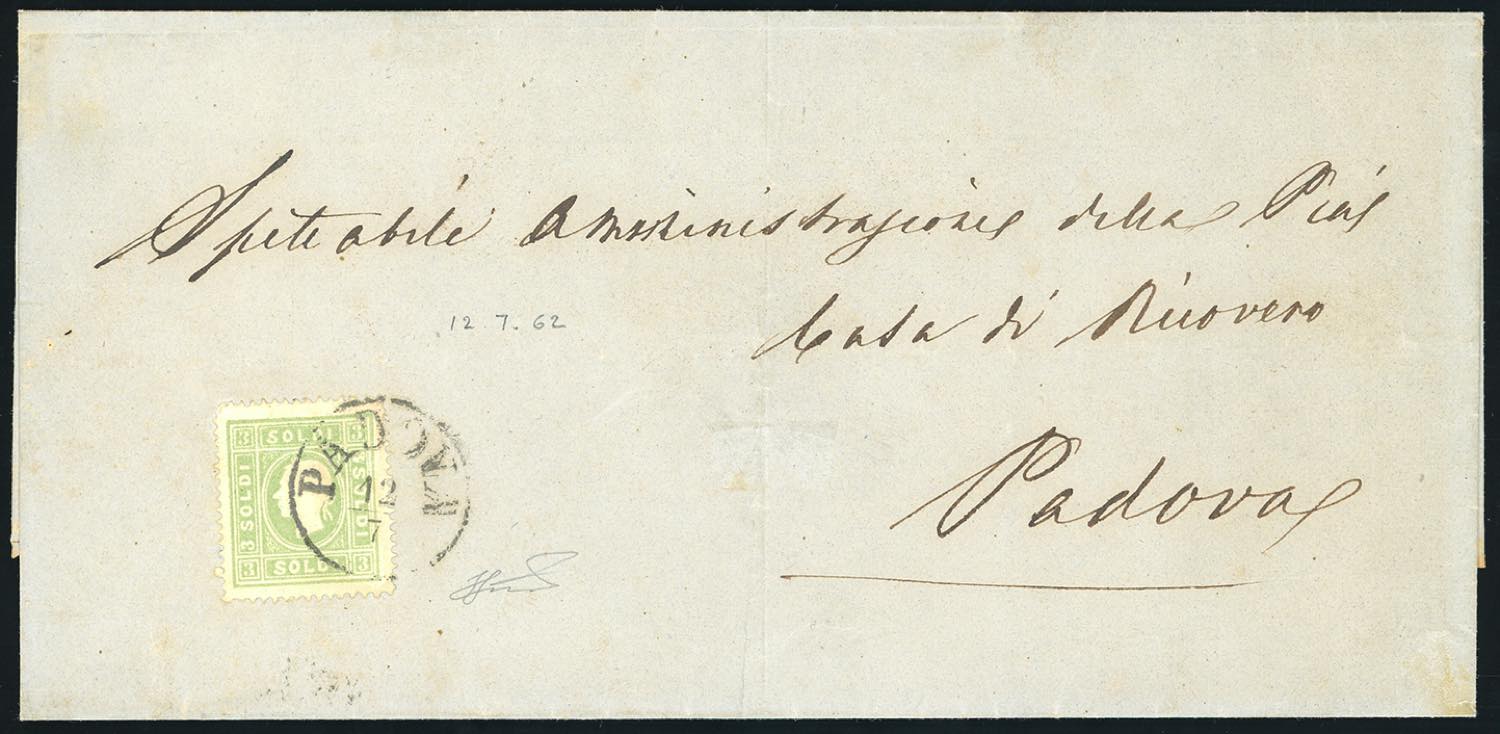 1862 - 3 soldi verde giallo (35), perfetto, isolato su lettera da Padova 12/7/1862 per città. Ferrario.