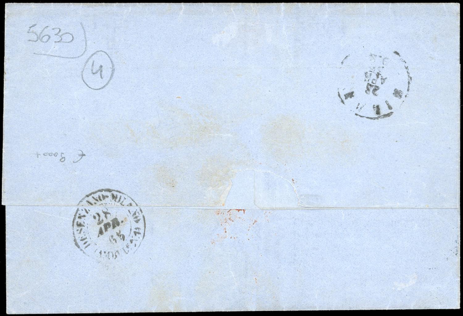 1865 - 2 soldi giallo, dent. 14, tre esemplari, 10 soldi azzurro, dent. 9 1/2 (36,44), perfetti, su fresca lettera da Verona 28/4/1865 a ... Leggi tutto