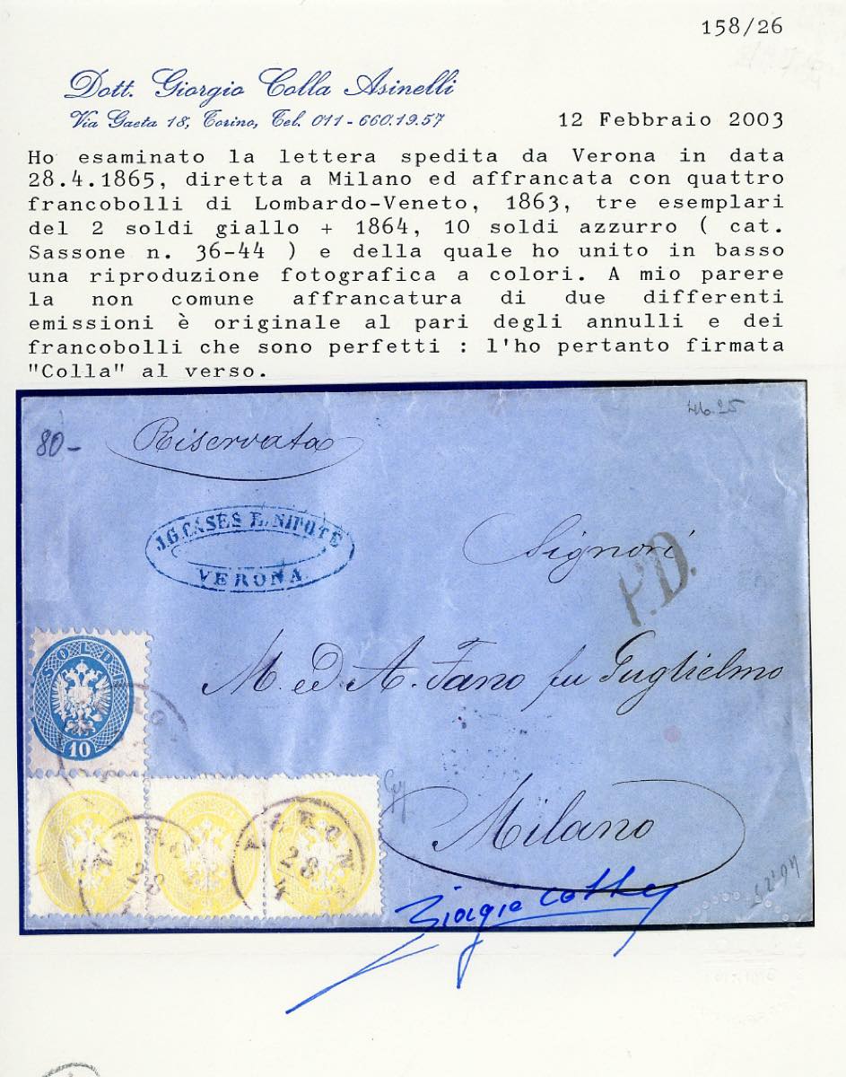 1865 - 2 soldi giallo, dent. 14, tre esemplari, 10 soldi azzurro, dent. 9 1/2 (36,44), perfetti, su fresca lettera da Verona 28/4/1865 a Milano. Bella. Cert. Colla.