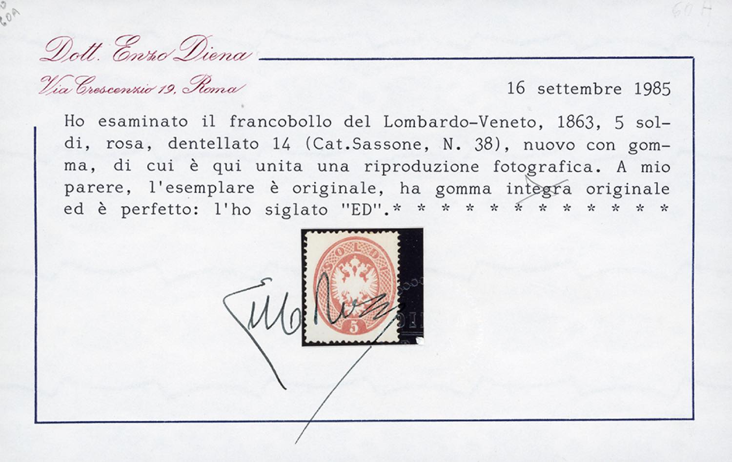 1863 - 5 soldi rosa, dent. 14 (38), gomma originale, impercettibile traccia di linguella, perfetto. Raro e molto fresco. A.Diena, cert. E.Diena.