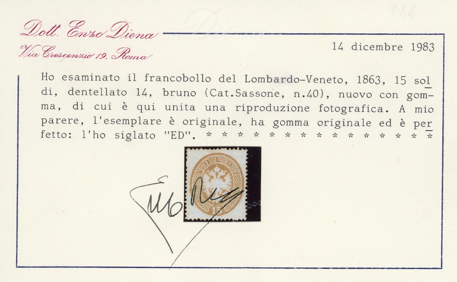 1863 - 15 soldi bruno, dent. 14 (40), gomma originale, perfetto. Raro. Cert. E.Diena.