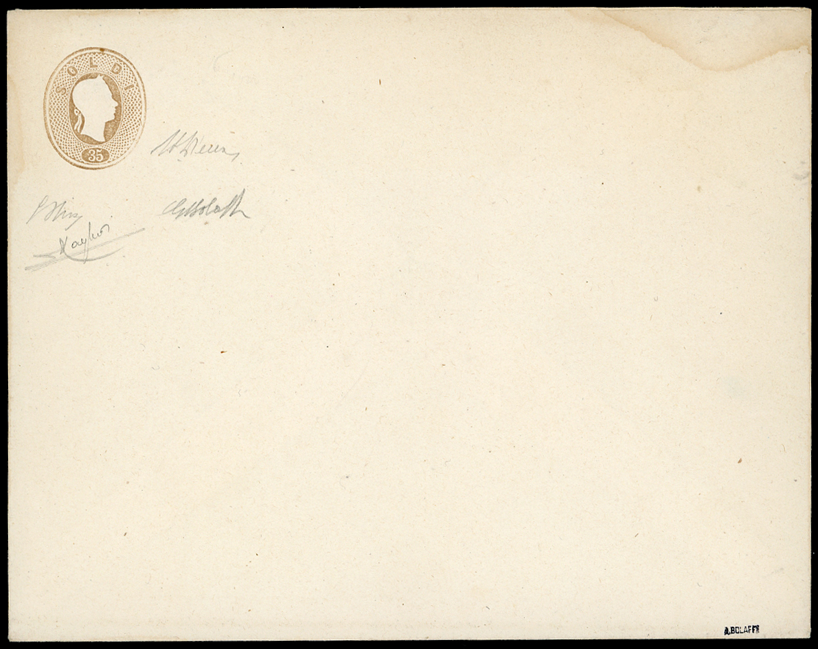 1861 - Testine, buste postali di grande formato, mm. 148x118, serie completa di otto valori (1/8), nuove, perfette ed in splendido stato di conservazione, ad eccezione dell'esemplare da 35 soldi che presenta lievi tracce di umidità. Della busta da 20 soldi arancio sono noti solo tre esemplari. INSIEME UNICO, grande rarità del settore. G.Bolaffi, A.Diena, G.Oliva e cert. Raybaudi per ciascun esemplare. (cat. Sassone € 42.150, cat. Ferchenbauer € 19.200).