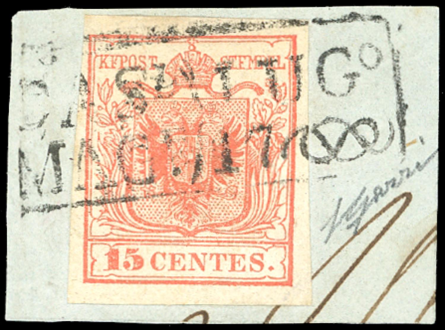 CASALMAGGIORE, Rd punti R2 - 15 cent. (3), perfetto, usato su frammento il 17/7/1850. Raro annullo, molto nitido. Golinelli, cert. E.Diena.