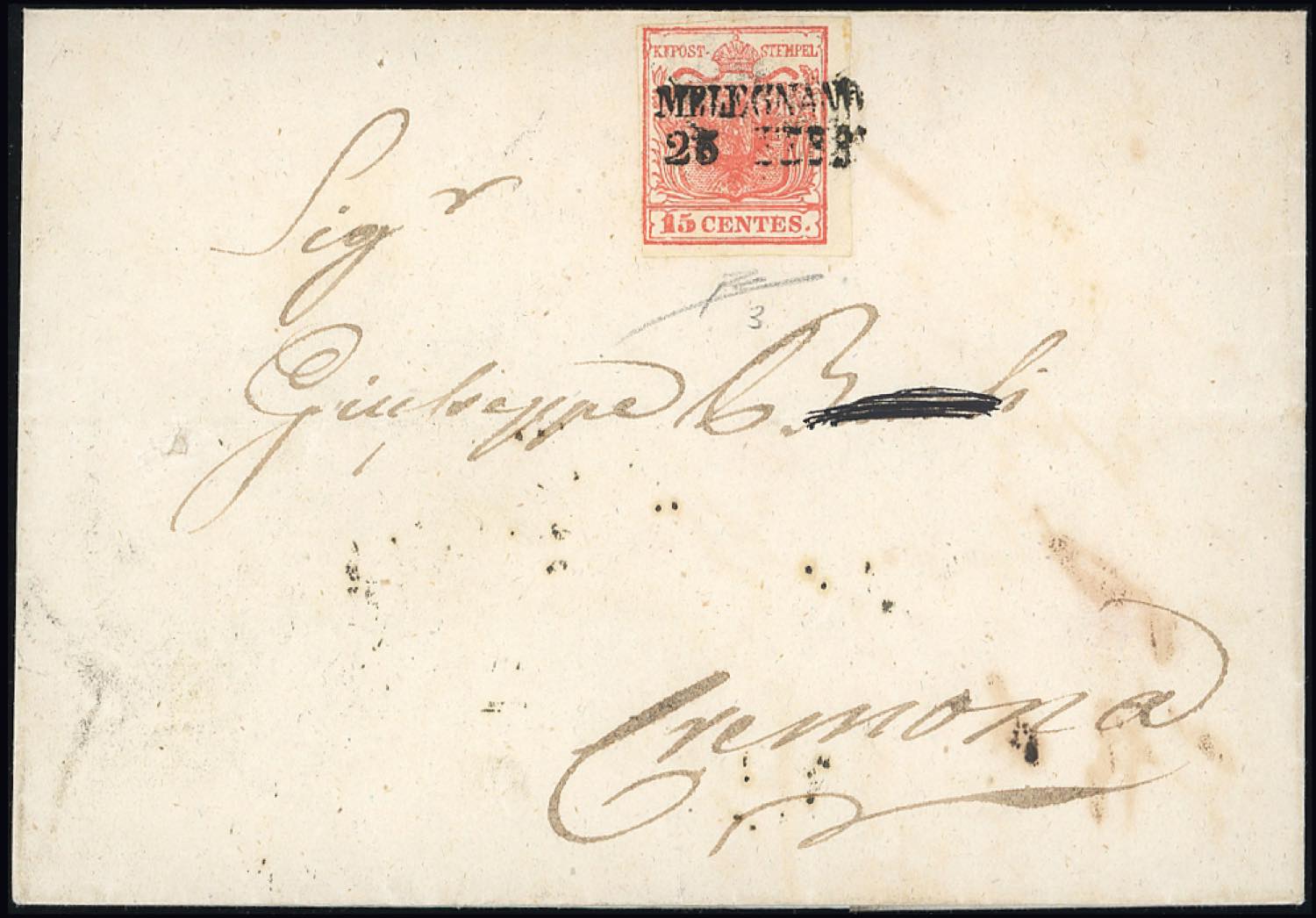 MELEGNANO, SD punti 12 - 15 cent. (3), giusto in un punto a sinistra, su sovracoperta di lettera del 25/2/1851 per Cremona. Molto fresca. R.Diena.