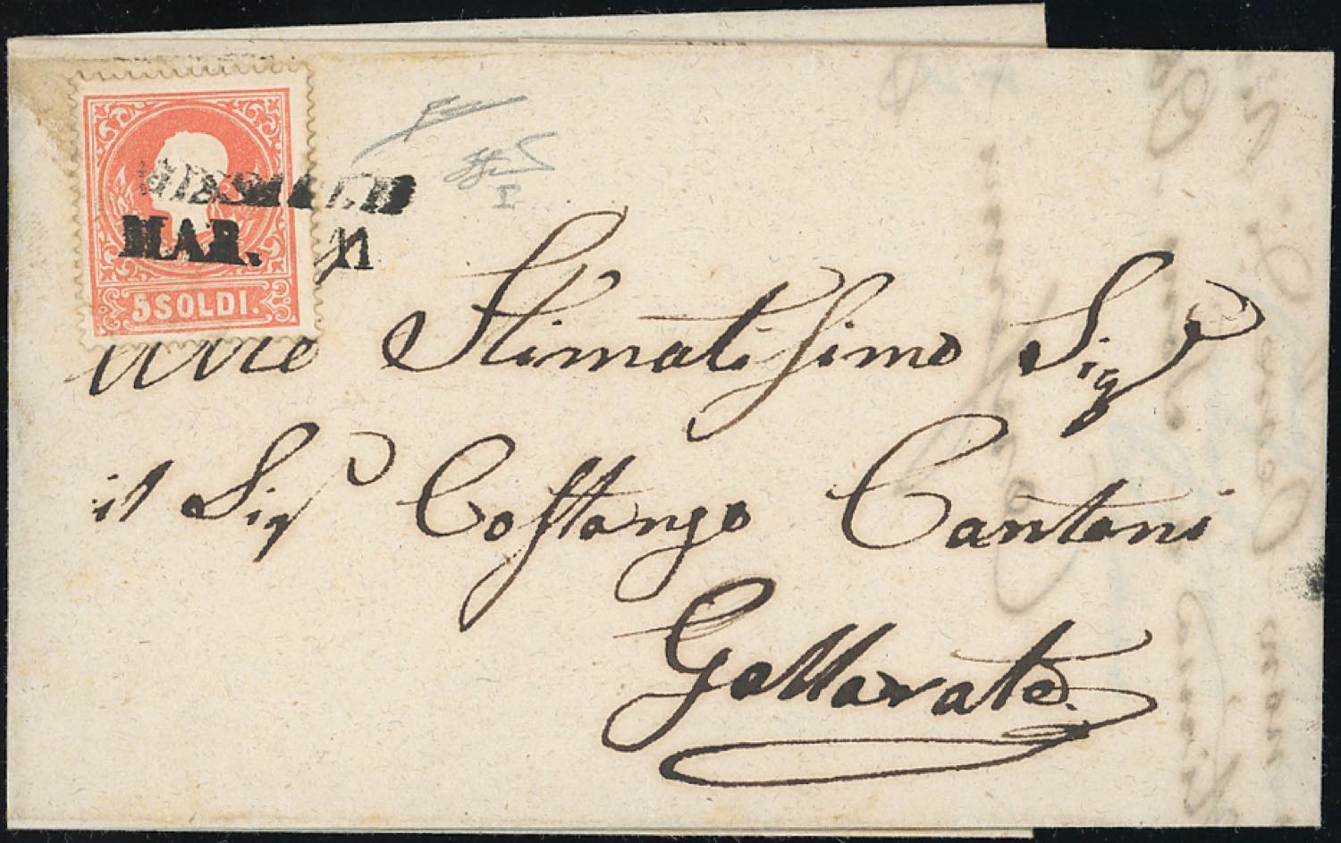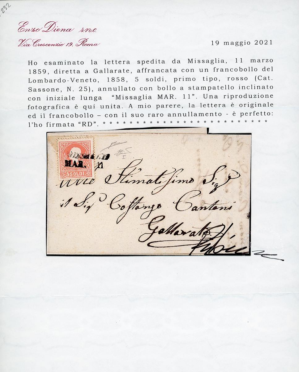 MISSAGLIA, punti 13 - 5 soldi (25), perfetto, su lettera dell'11/3/1859 per Gallarate. Rara. Ferrario, cert. Diena.