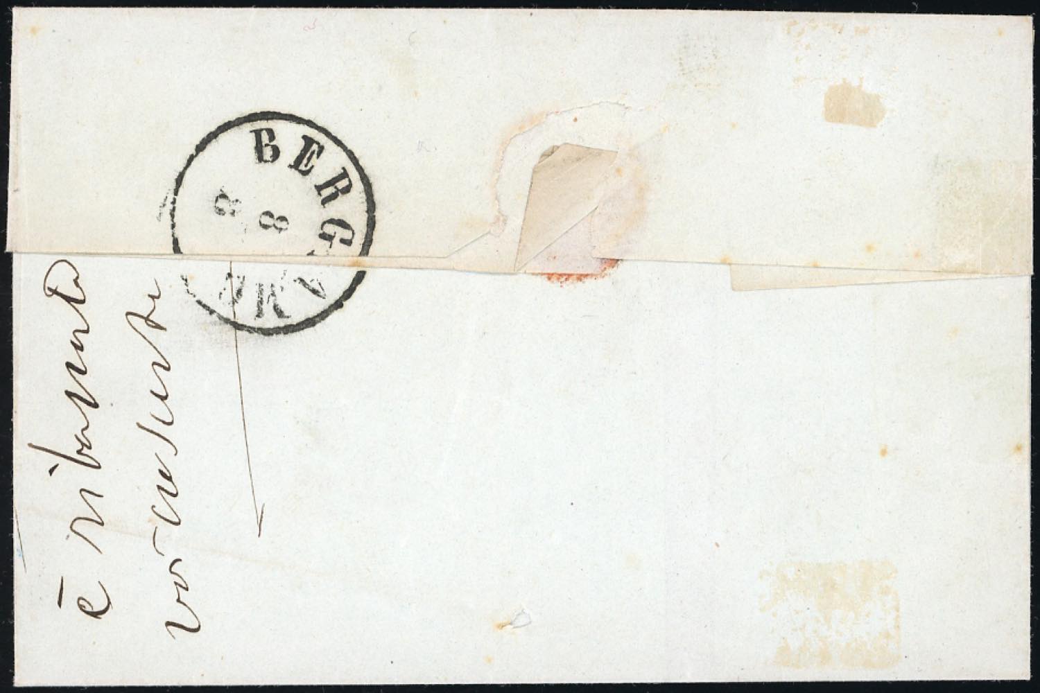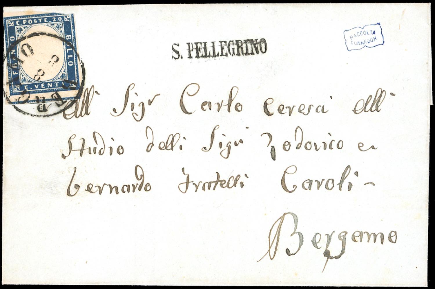 SAN PELLEGRINO, provvisorio SD senza data punti R2 - 20 cent. IV emissione di Sardegna (15C), difettoso in alto, su fresca lettera per Bergamo 8/8, francobollo annullato in arrivo. Molto rara e di ottimo aspetto. Poche lettere conosciute.