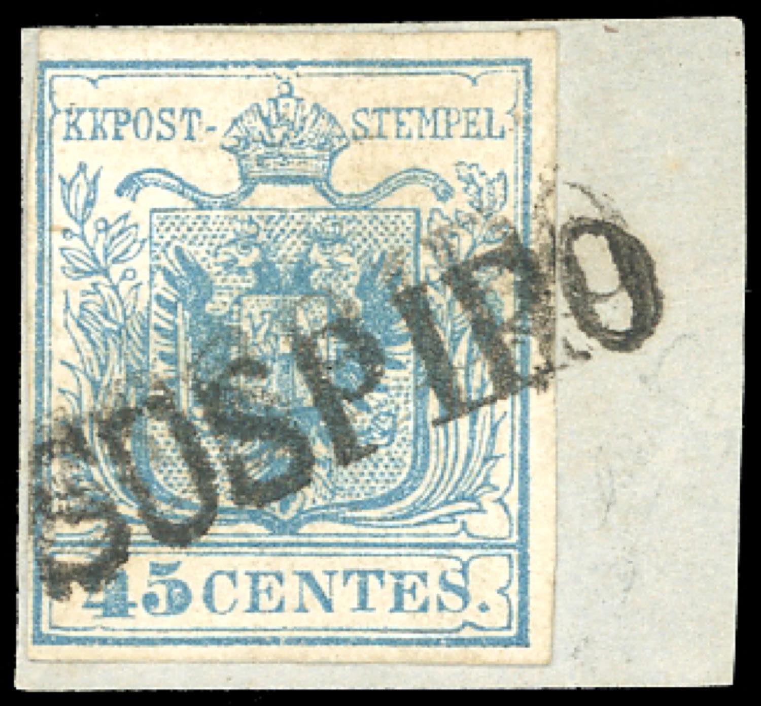 SOSPIRO, SD s.d. punti R1 - 45 cent. (12), perfetto, usato su frammento. Raro annullo, specie su questo francobollo.