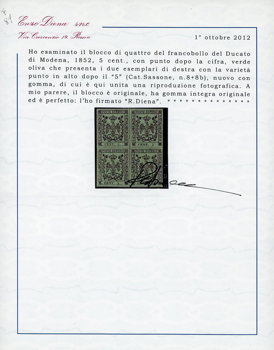 1855 - 5 cent. verde oliva, blocco di quattro con i due esemplari di destra con varietà punto in alto dopo il 5 (8b+8), gomma originale integra, perfetto. Raro. Cert. Diena.