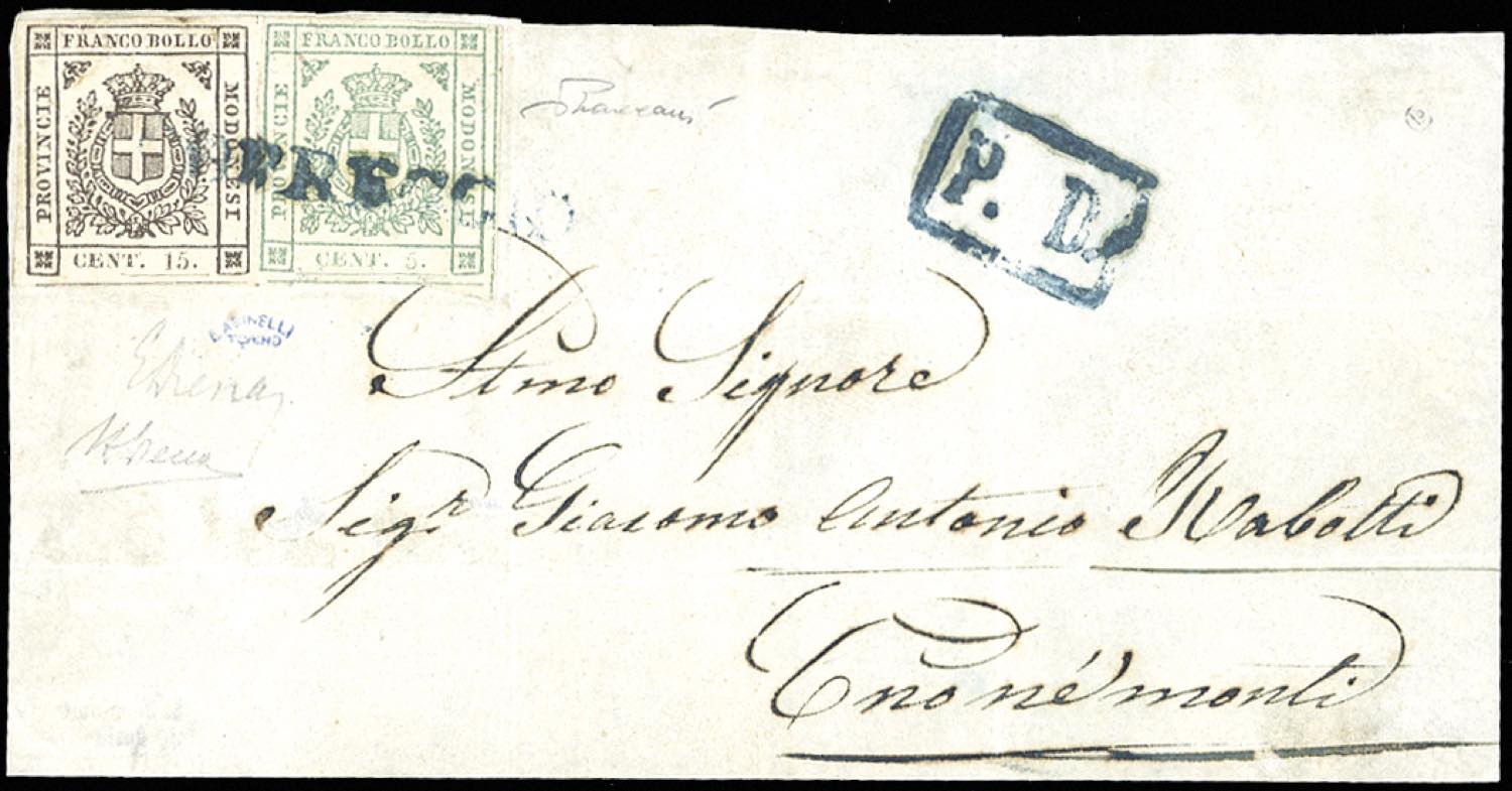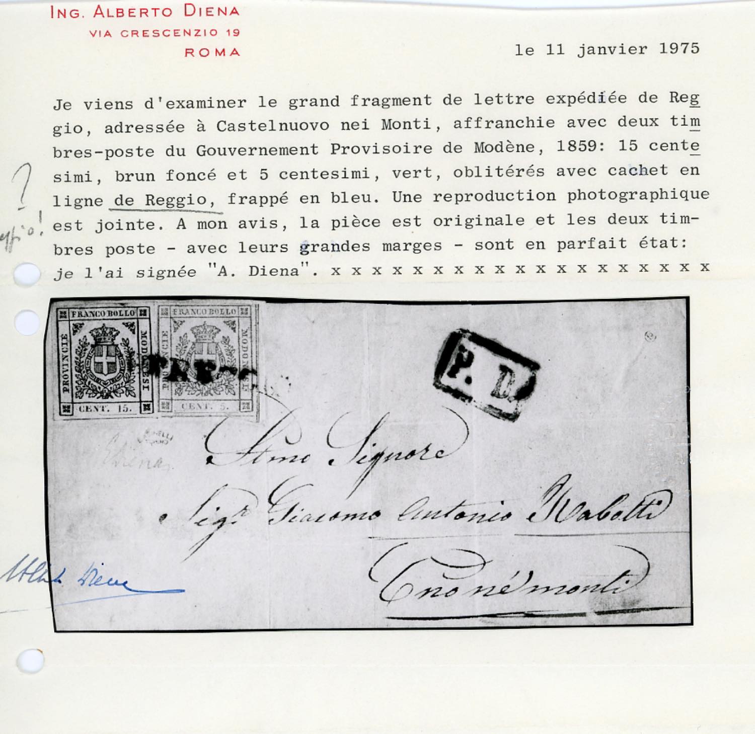 1859 - 15 cent. bruno scuro, 5 cent. verde (13a,12), perfetti e ben marginati, su frontespizio completo di lettera da Correggio a Castelnuovo ne'Monti, bolli in azzurro scuro. Molto bello. Em.Diena, cert. A.Diena e Vaccari.