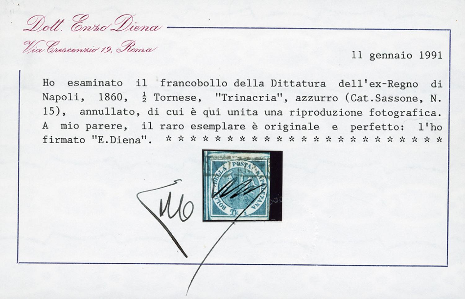 1860 - 1/2 tornese azzurro Trinacria (15), decalco parziale, perfetto, colore molto intenso e vivo, tre margini eccezionali, usato, annullo leggero. Bello e raro. Em.e A.Diena, cert. E.Diena.