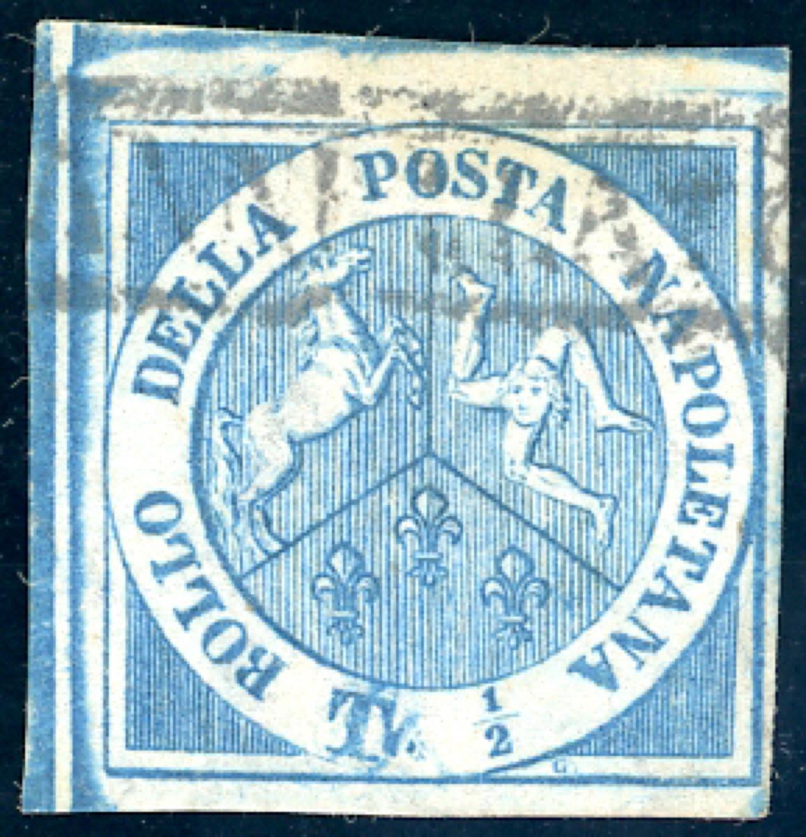 1860 - 1/2 tornese azzurro Trinacria (15), decalco parziale, perfetto, colore molto intenso e vivo, tre margini eccezionali, usato, annullo ... Leggi tutto