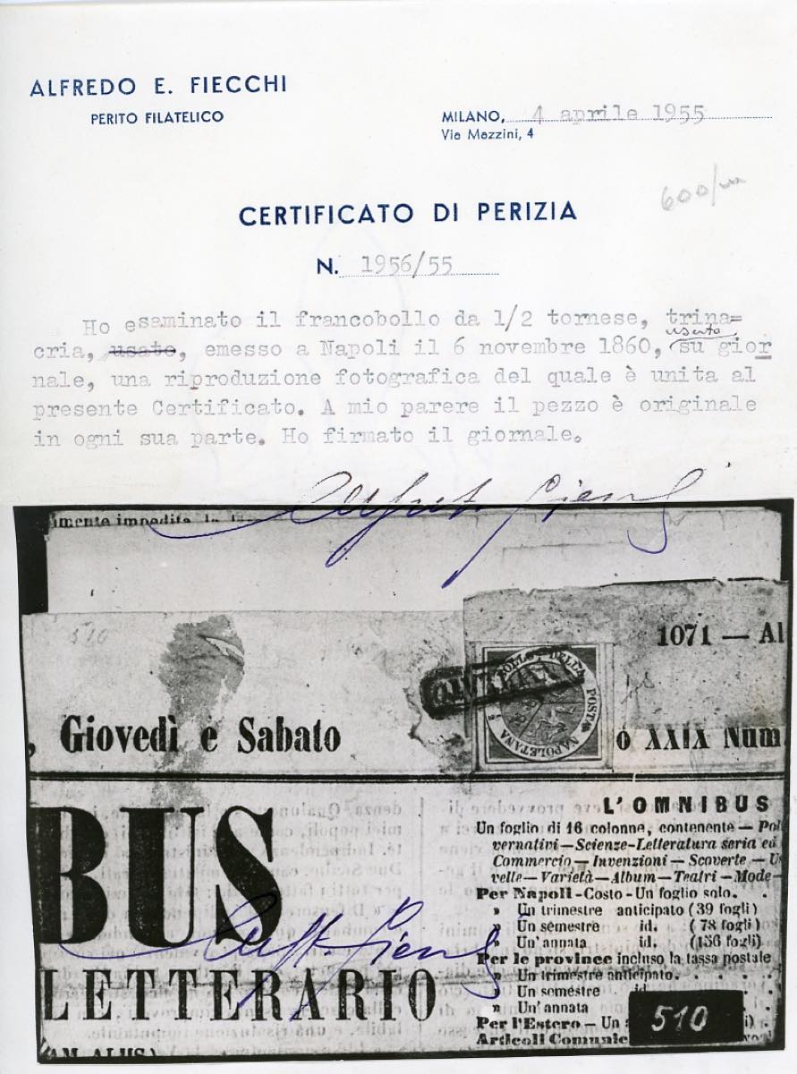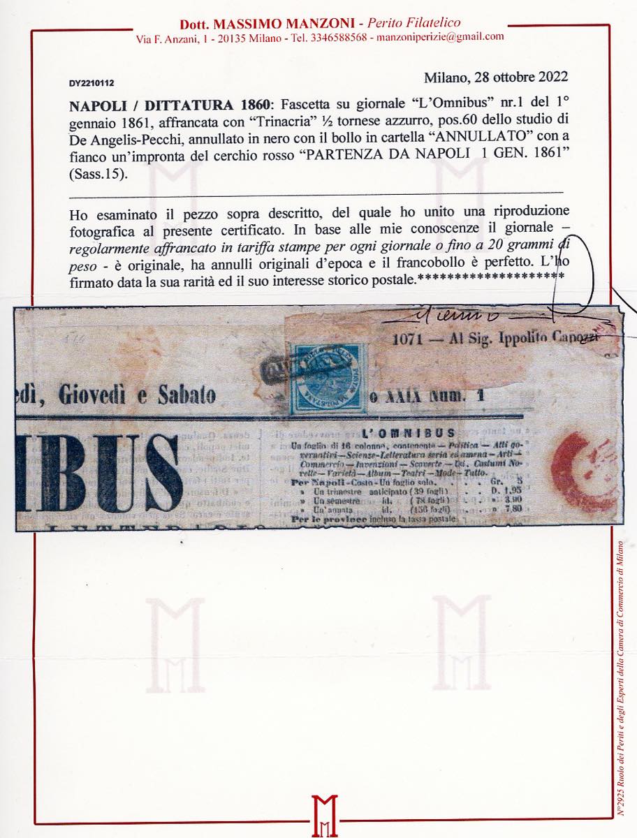 1861 - 1/2 tornese azzurro Trinacria (15), pos. 60 dello studio De Angelis-Pecchi, perfetto, su giornale "L'Omnibus" da Napoli 1/1/1861. Raro. Em.Diena, cert. Fiecchi e Manzoni.