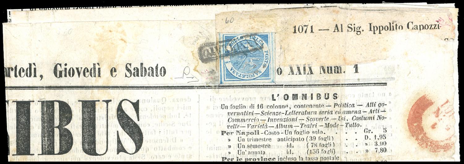 1861 - 1/2 tornese azzurro Trinacria (15), pos. 60 dello studio De Angelis-Pecchi, perfetto, su giornale "L'Omnibus" da Napoli 1/1/1861. ... Leggi tutto