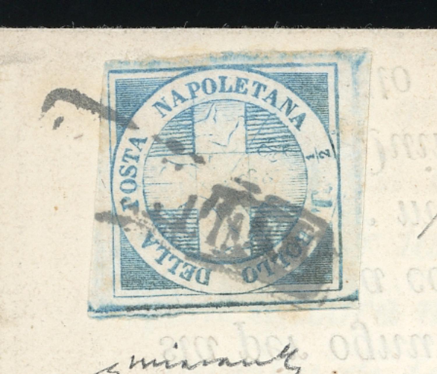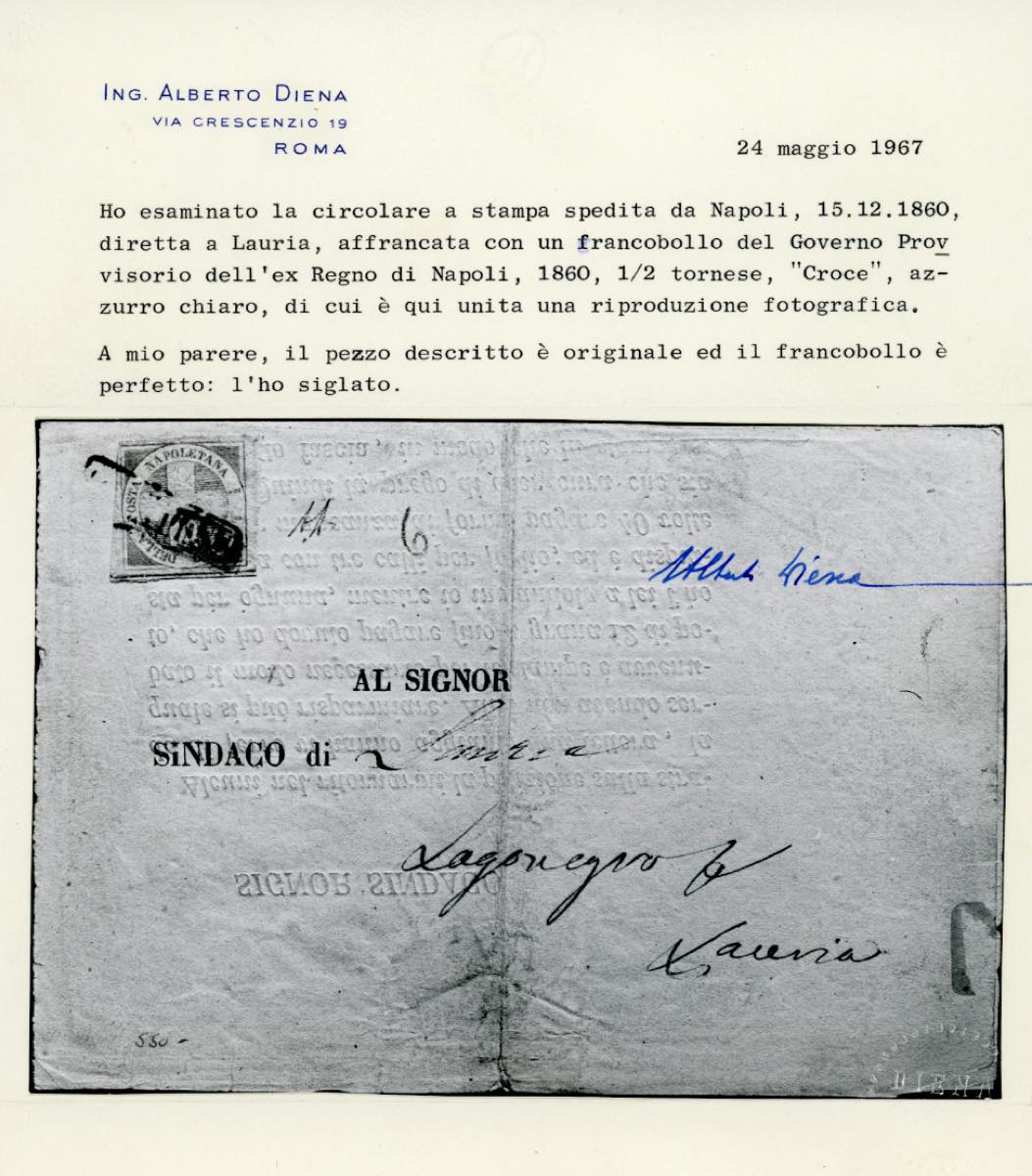 1860 - 1/2 tornese azzurro chiaro Crocetta (16a), perfetto, su circolare da Napoli 15/12/1860 a Lauria. Molto rara e bella! Chiavarello, cert. A.Diena.