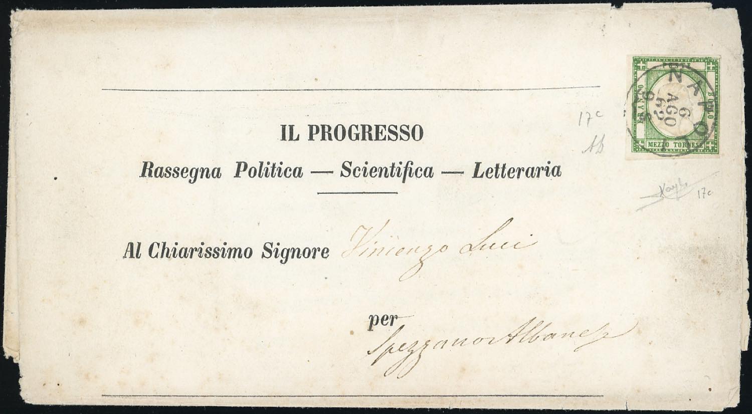 1862 - 1/2 tornese verde scuro (17c), perfetto, isolato su circolare a stampa da Napoli 6/8/1862 a Spezzano Albanese. A.Diena, Raybaudi.