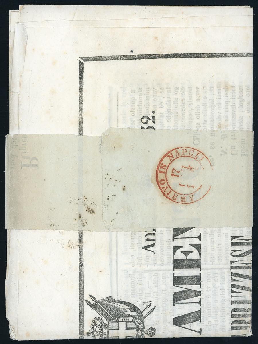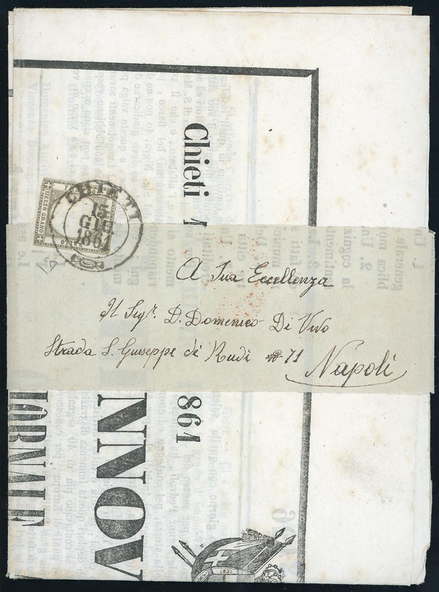 1861 - 1/2 grano bruno grigiastro (18c), margini da ampi a giusti, isolato su fascetta completa di giornale da Chieti 15/6/1861 a Napoli. Rara e di eccezionale aspetto. E.Diena. Ex coll. Imperato.