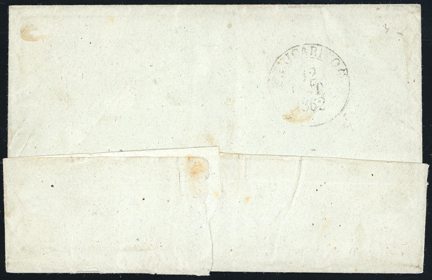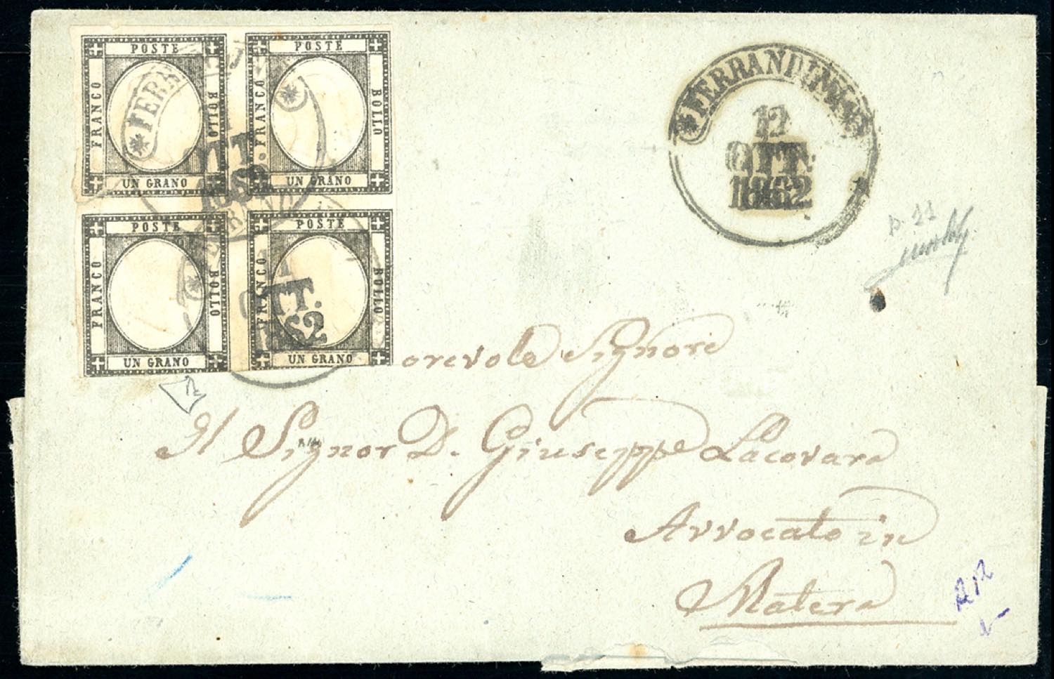 1861 - 1 grano nero grigiastro (19), blocco di quattro con difetti, su fresca sovracoperta di lettera da Ferrandina 13/10/1862 a Matera. (punti 11). Raro uso postale del blocco di quattro, impreziosito dalla data d'uso nel breve periodo di tolleranza dall'1 al 15 ottobre 1862. Cert. E.Diena.